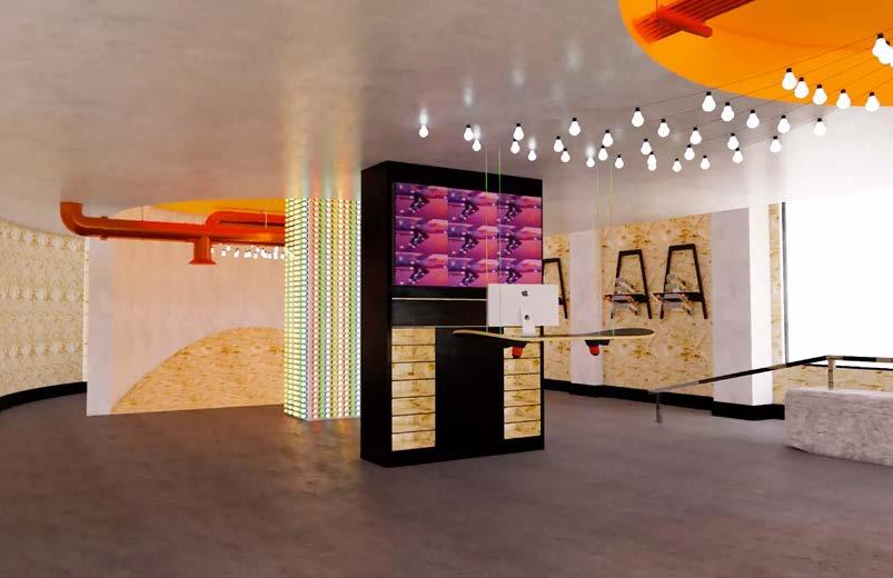 Este espacio cuenta con un volumen abierto rectangular en el que se divide en dos por medio de los pILres, un local luminoso gracias a su gran cantidad de ventanales, una de las ventanas va a ser sustituida por una puerta dando aceso direccto al almacen. Para evitar el desgaste de los muebles el mobiliario será colgante o alnclado a la pared en su totalidad, prentendo conseguir una mayor fluidez.