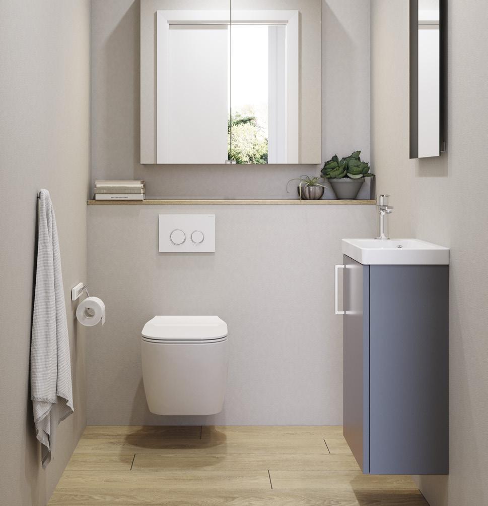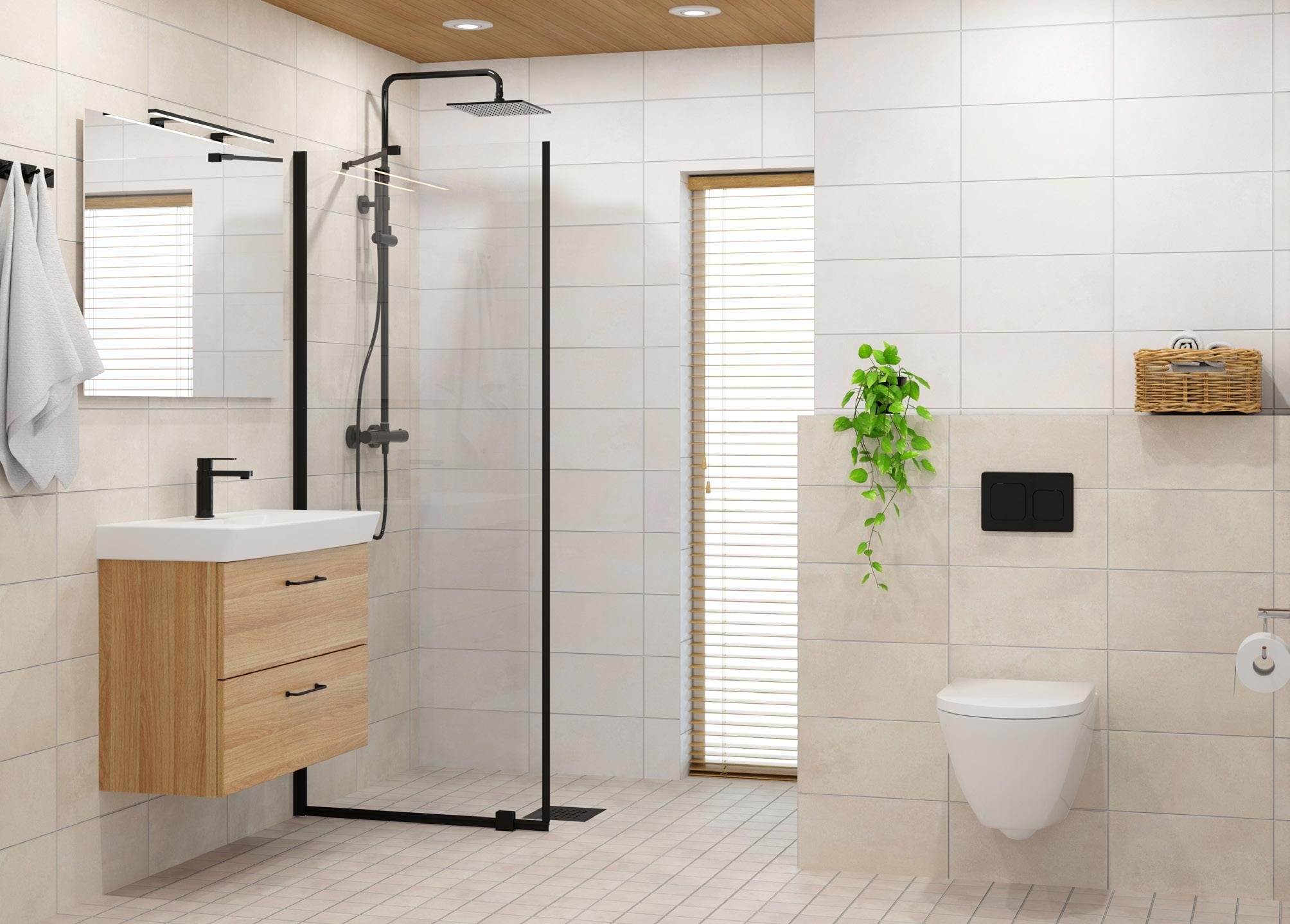 Tilan käytännöllisyys ja toimiva arki kulmasuihkuelementti, seinäkiinnitteiset kalusteet ja seinäwc-ratkaisu.