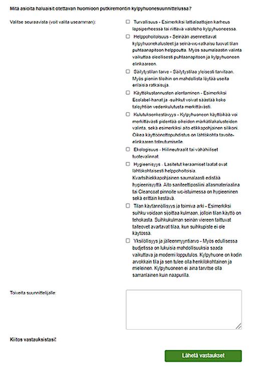 Ennen suunnittelun aloitusta voimme yhdessä toteuttaa taloyhtiön asukkaille kyselyn, jossa osallistetaan asukkaat antamaan näkemyksensä siitä, minkälaisia asioita he toivoisivat otettavan huomioon kylpyhuonesuunnittelussa. Näiden toiveiden pohjalta suunnittelijan on käteva aloittaa suunnittelu.