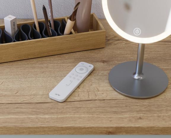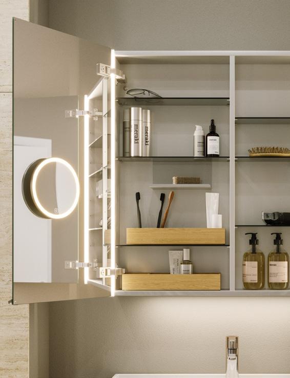 Integroidulla valaistuksella ja valaistuksenohjauksella Handy-meikkauspeiliä voidaan käyttää kaikkialla. Kuvassa peili on peilikaapissa magneettipidikkeessä, ja voit halutessasi ottaa peilin vaikka matkalle mukaan. Peilin voi ladata kätevästi integroidusta USB-liitännästä.