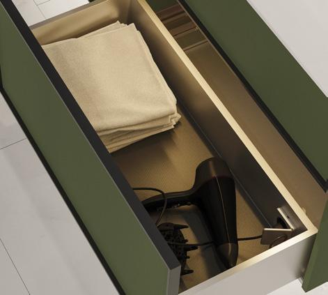 Laatikoissa on metallisivut ja integroidut liukukiskot. Laatikot ovat täysin ulosvedettäviä ja niissä on äänetön palautusmekanismi. Laatikoiden sisustusta voi itse säätää.