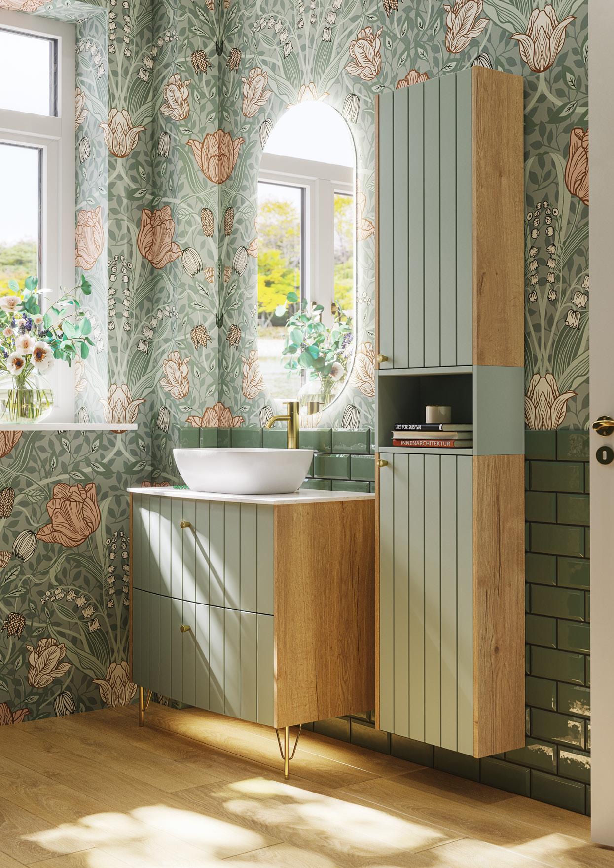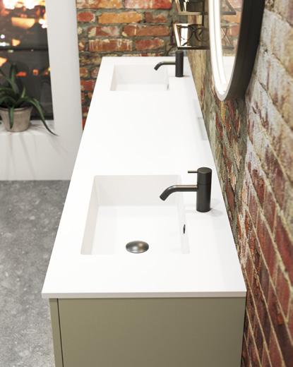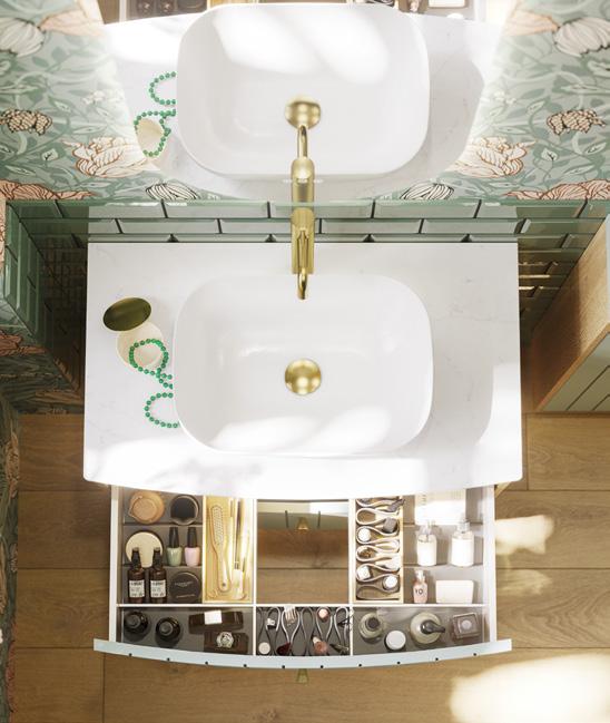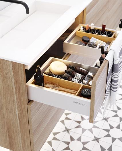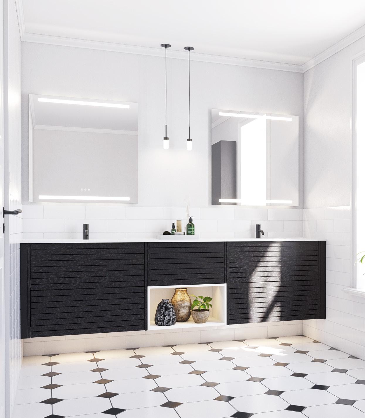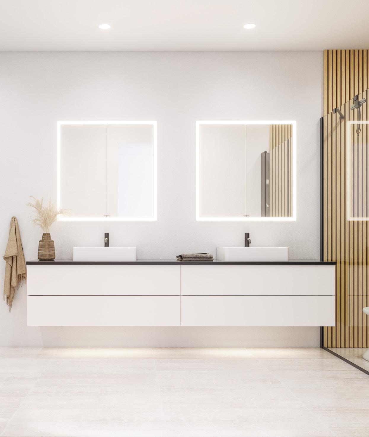 Symmetrinen ilme, jossa kaunis, lämmin tammiviimeistely hallitsee vetimetöntä, pelkistettyä push open -etuosaa. Trendikkäät kaksoisaltaat uudessa, tilatehokkaassa ratkaisussa jakavat aamurutiinit peilin edessa, jossa valaistuksen sävyä ja voimakkuutta voi säätää vuorokauden ajan mukaan.