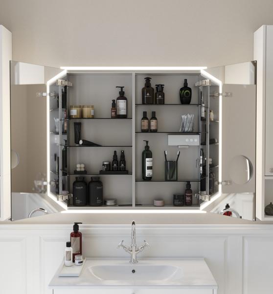 Illumi-hylly luo yhtenäisyyttä muotoiluun ja on todella käytännöllinen runsaalla hyllytilallaan ja kauniiilla, sisäänrakennetulla valaistuksellaan.
