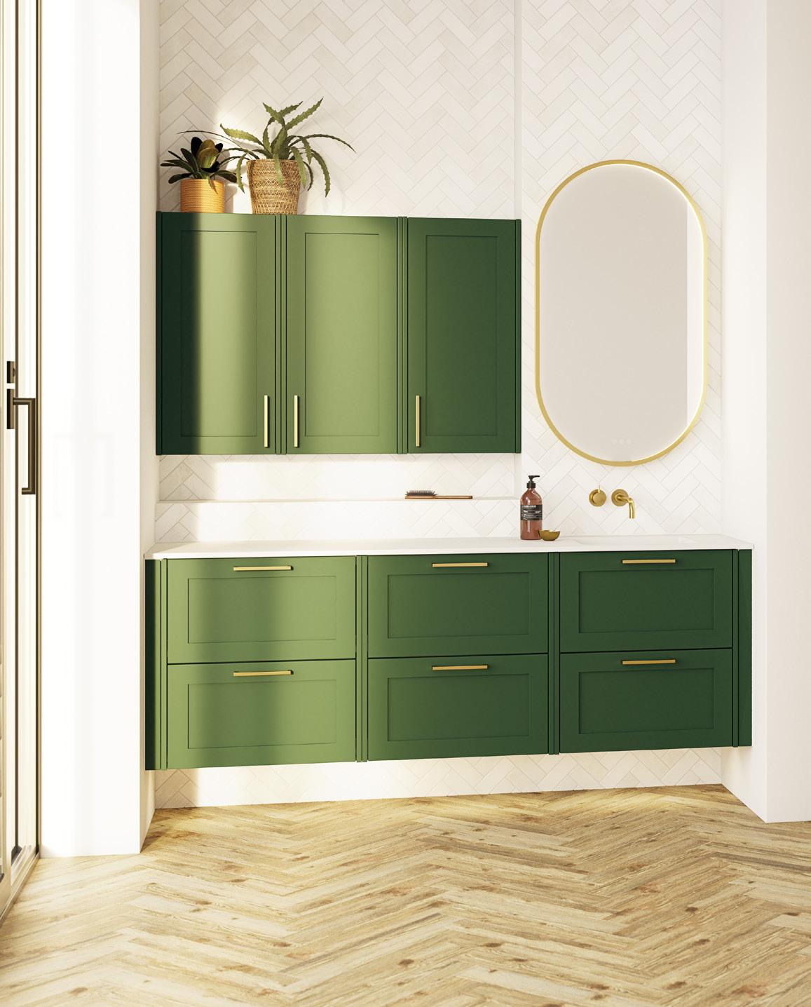Classicin klassisen vihreän ja kauniiden messinkisten yksityiskohtien yhdistelmä tekee kylpyhuoneesta ylellisen hyvinvoinnin keitaan. Kalusteet, allas ja pöytätaso muodostavat syvennykseen räätälöidyn kokonaisuuden. Huomaa kätevät yläkaapit, joissa säilyvät niin hammasharjat kuin ihonhoitotuotteet ja joissa ne ovat aina käden ulottuvilla, mutta eivät ikävästi näkyvillä.