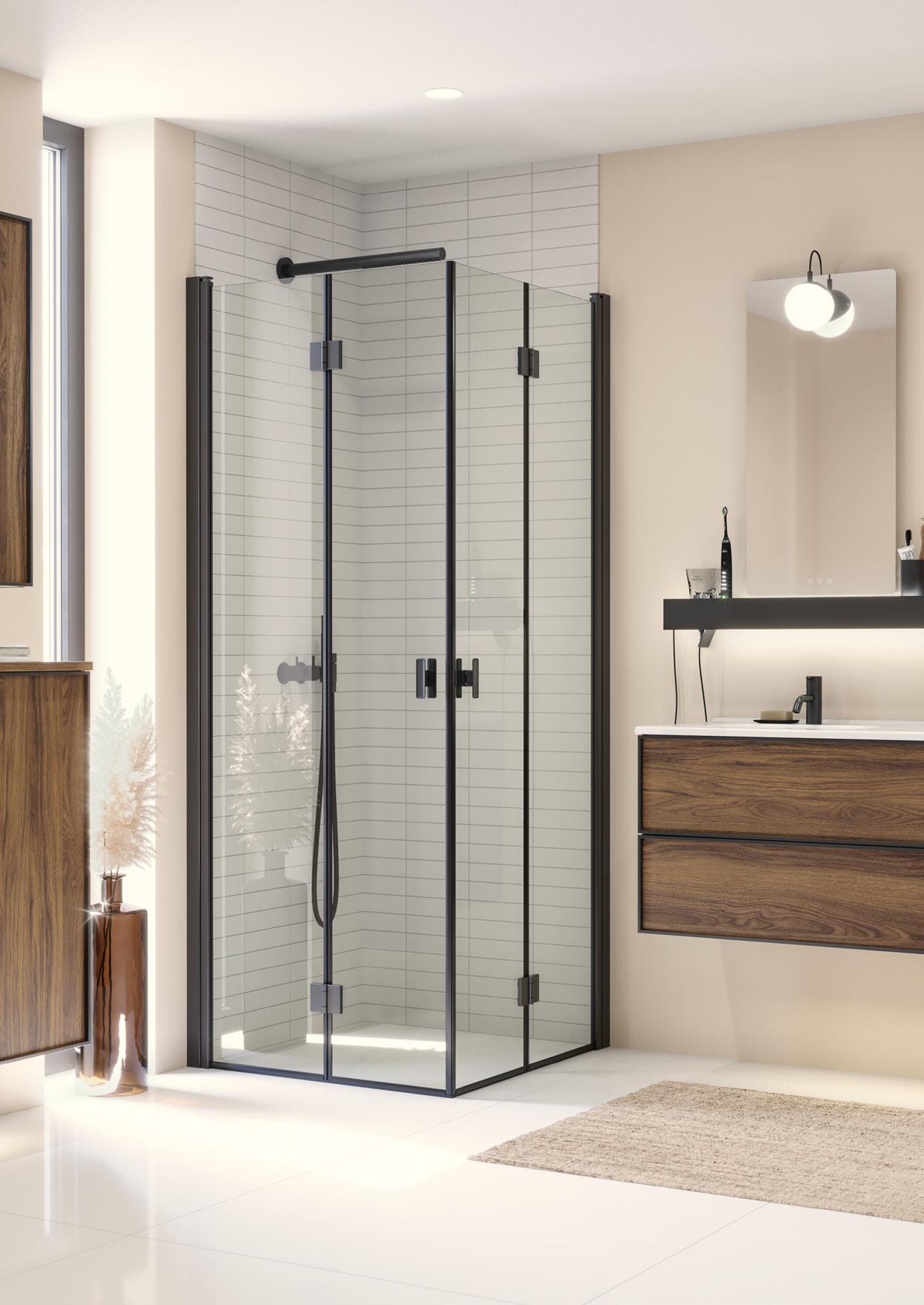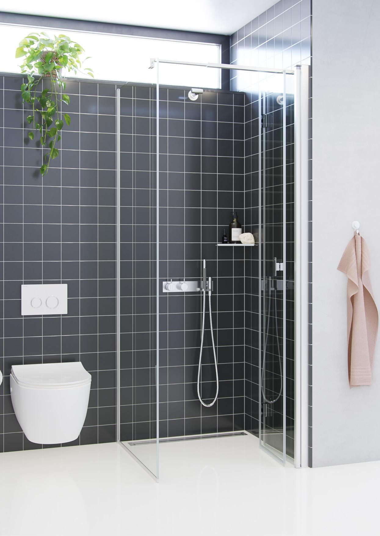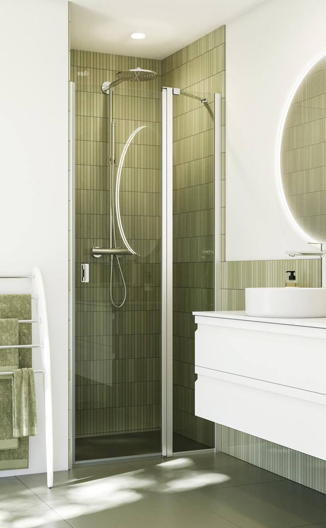 Voit hyödyntää tilan suihkunurkkaan saakka, kun valitset kääntöoven lyhyellä kiinteällä levikepaneelilla. Kun suihku ei ole käytössä, voit työntää oven sisäänpäin kalusteita kolhimatta ja saada lisää tilaa.