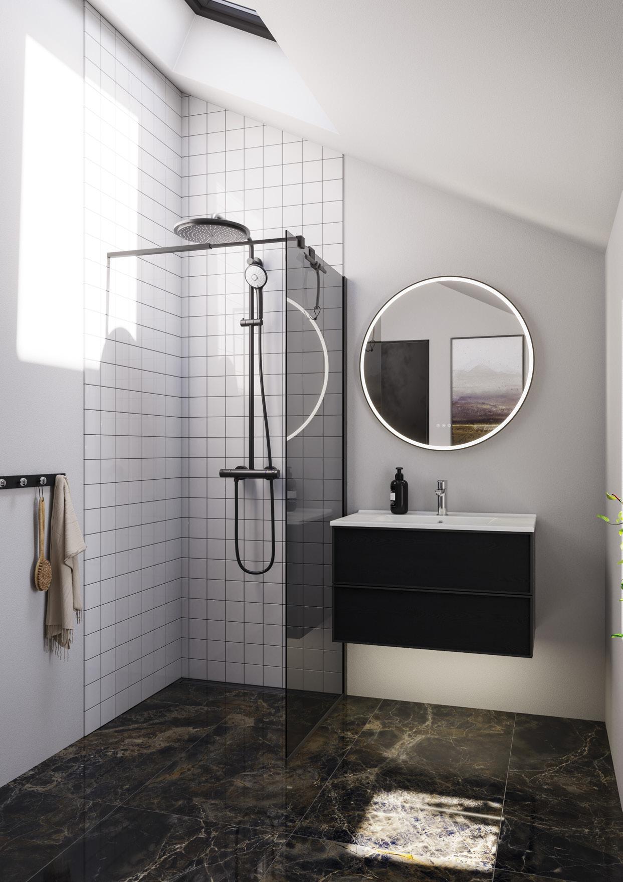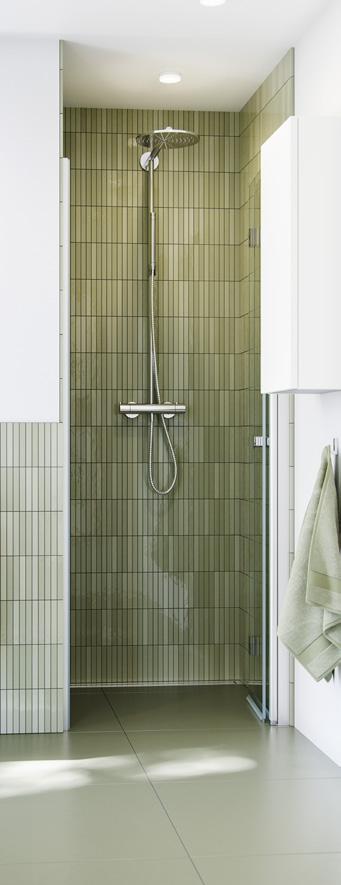 VINKKI PIENEEN KYLPYHUONEESEEN Match on täydellinen valinta pieneen kylpyhuoneeseen. Suihkutaiteovet voi kääntää pois tieltä, kun niitä ei käytetä. Voit myös valita kiinteän seinän, jolloin muita kalusteita voidaan asentaa lähelle suihkutilaa. Lisää ideoita sivulla 26.