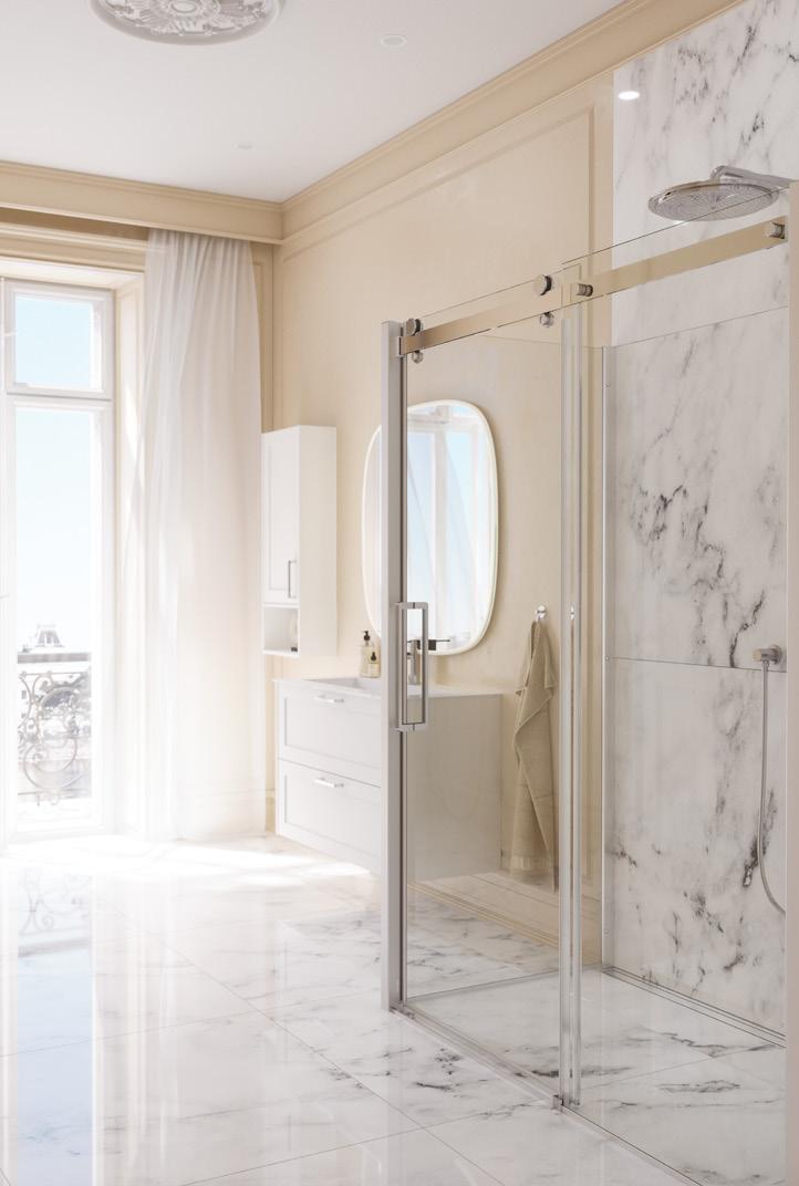 Suuret, helppokäyttöiset ja kätevät liukuovet. Täydellinen ratkaisu suihkunurkkaukseksi, mutta voidaan yhdistää myös kiinteisiin suihkuseiniin.
