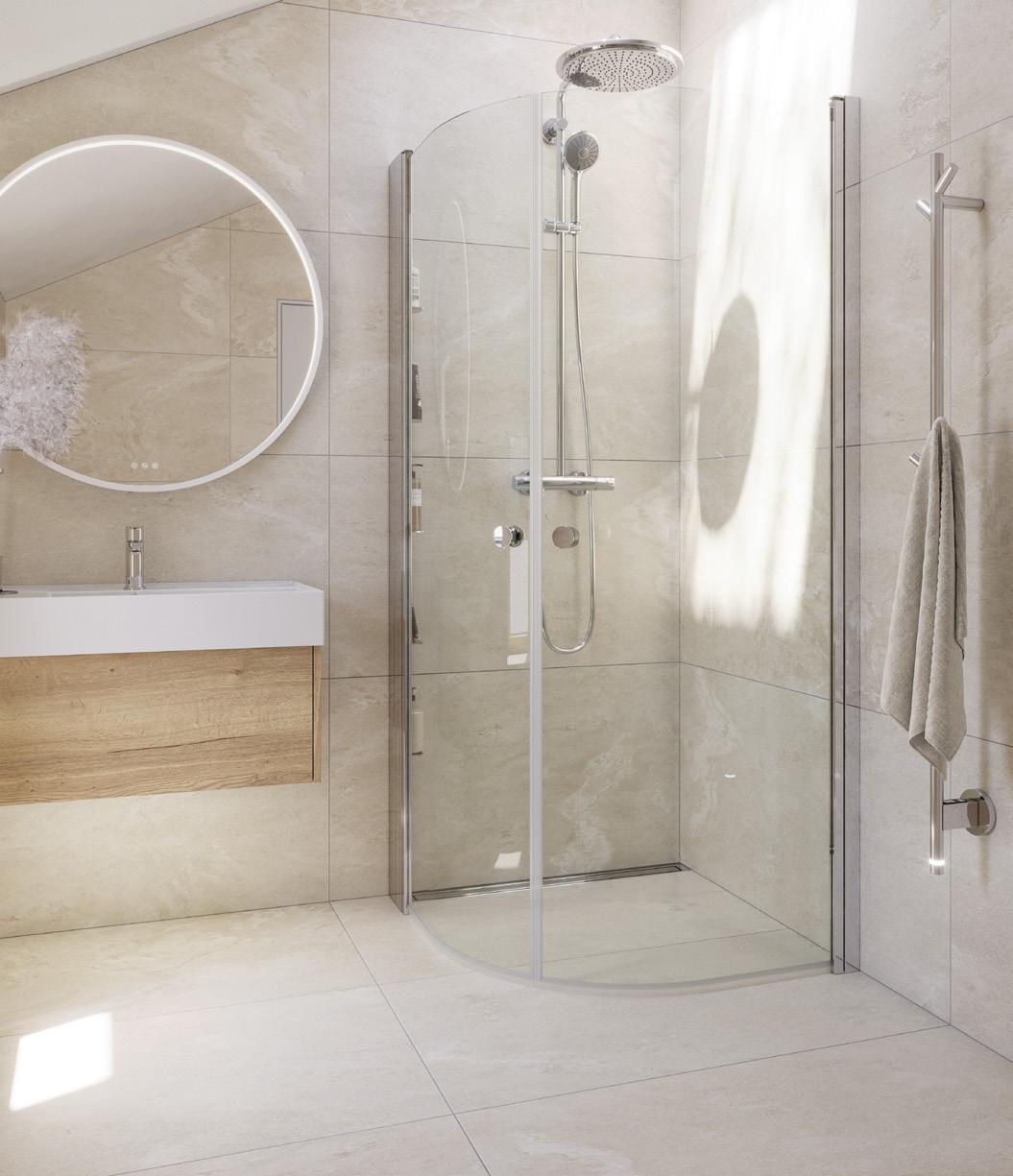Yksinkertaisuutta ja hienostuneisuutta yhdistävät kaarevat suihkuovet suihkukulmaksi asennettuna. Muotoilumme mahdollistaa ovien liikkeen kumpaankiin suuntaan, jolloin tilaan saadaan avaruutta, kun suihkua ei käytetä.