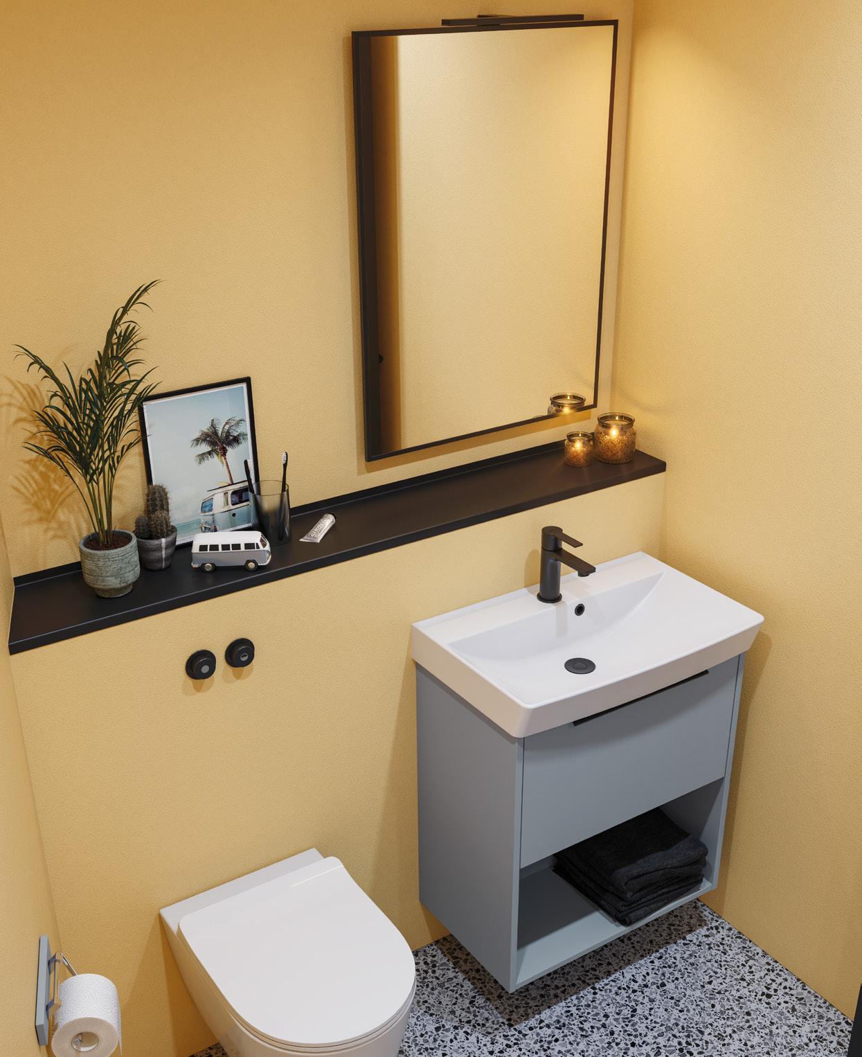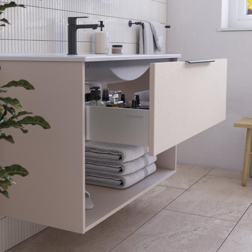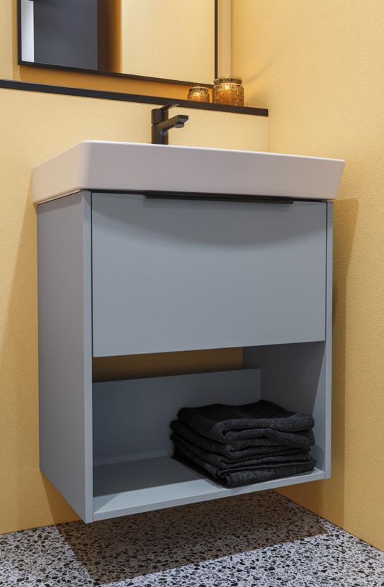 Valitse yksi vetolaatikko -yhdistelmä avoimen hyllyn kanssa ja käytä avointa hyllyä mm. värikkäiden pyyhkeiden kanssa tunnelman luomiseksi.