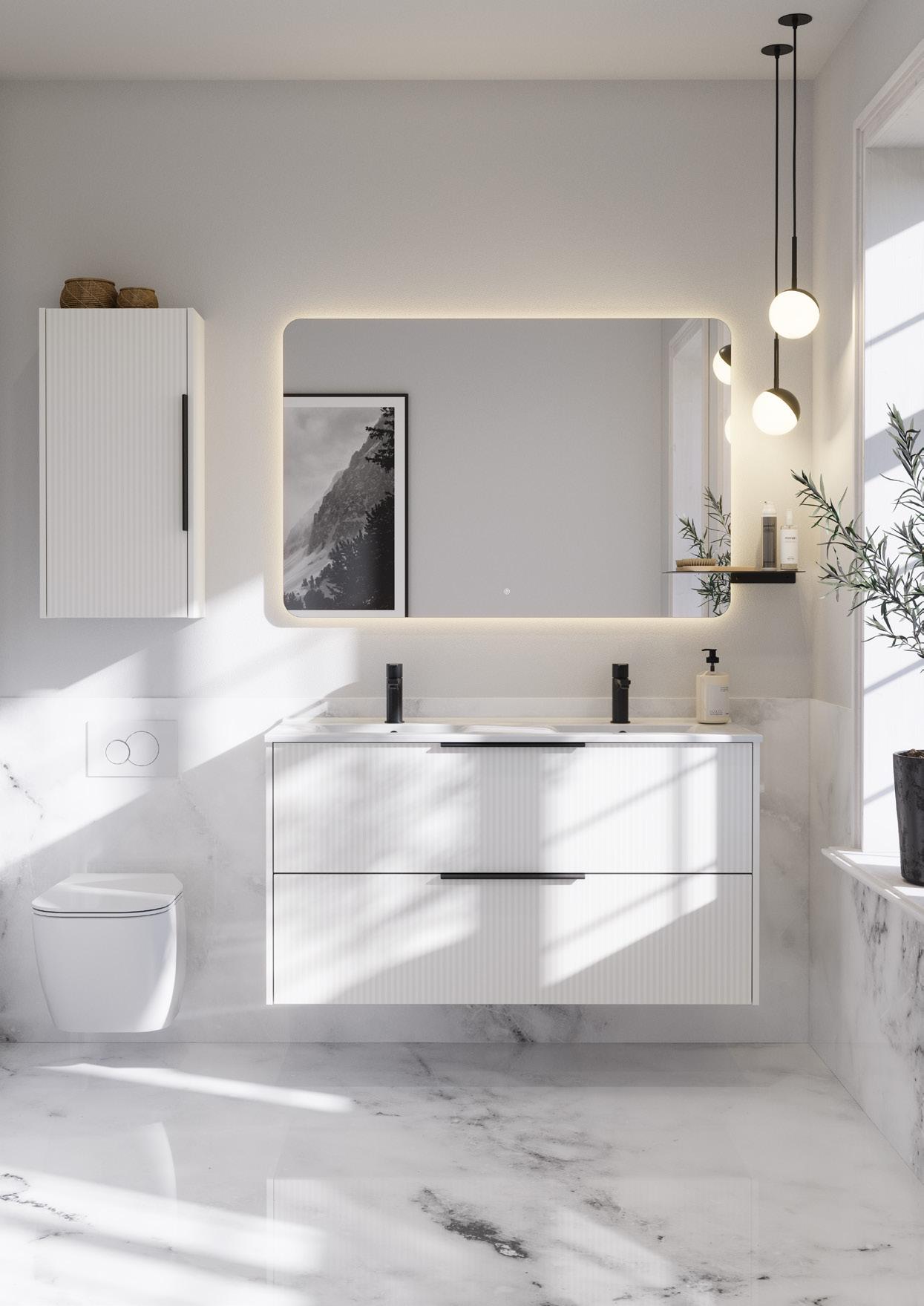 Klassinen valkoinen kylpyhuone yhdistettynä Mido Classicin uritettuihin etulevyihin luo kaunista, pohjoismaista eleganssia.
