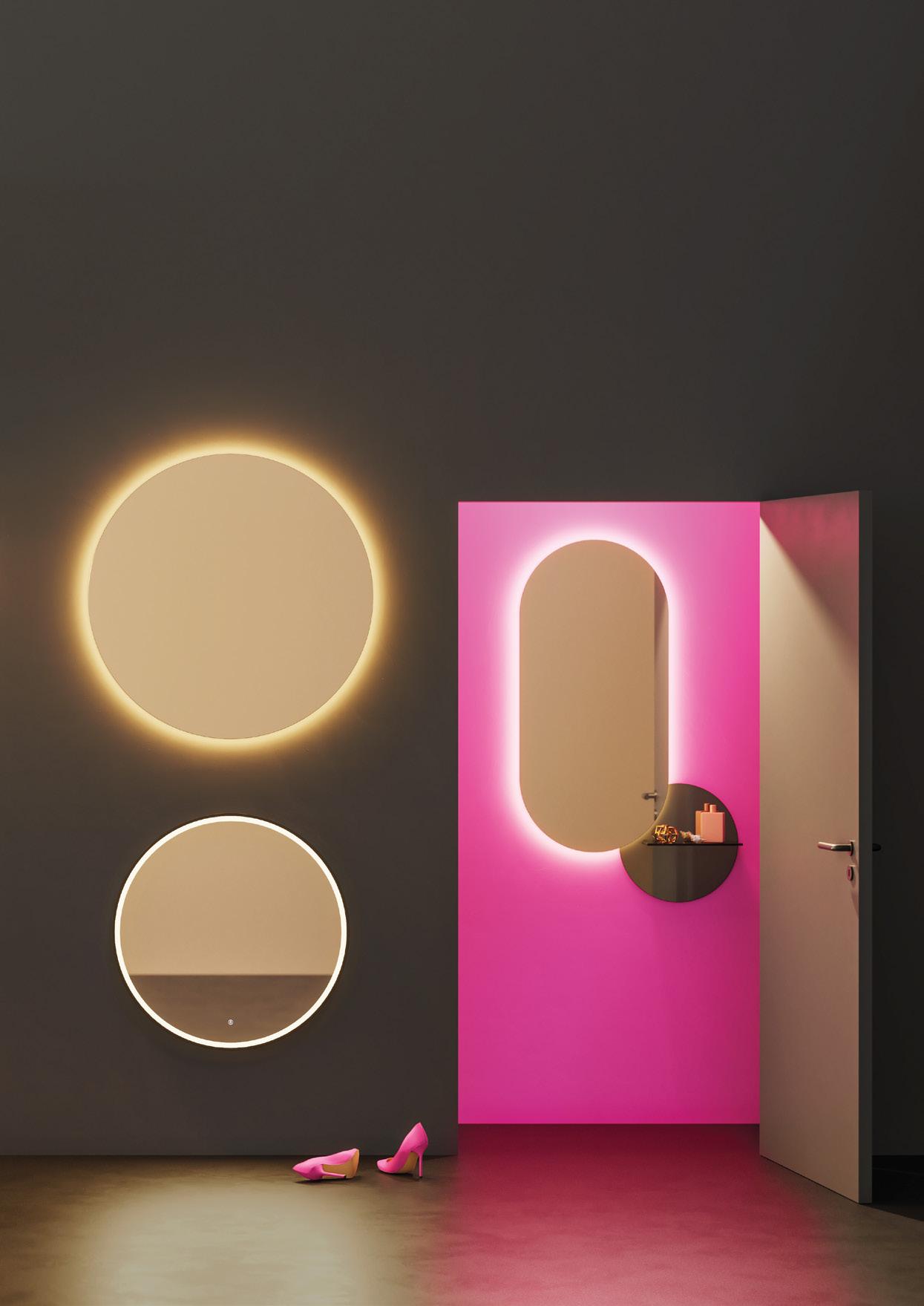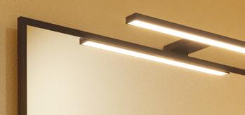 Kaikissa peileissä on säädettävät kiinnikkeet täydellisen lopputuloksen saavuttamiseksi, ja ne on varustettu energiansäästöisellä IP44-hyväksytyllä LED-valaistuksella, paitsi Select-mallissa, johon on saatavilla erikseen ostettavat 230 V:n valot. Peileissä on lisävarusteena lämmityselementti, joka vähentää huurtumista. Mustat peilikehykset on pulverimaalattu alumiinia.