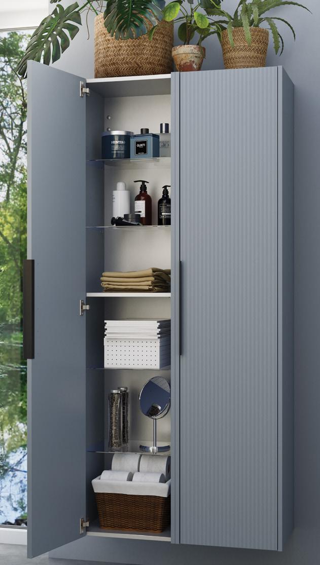 Mido Classic sileillä etuosilla ja hiekan värissä luo sisustukseltaan lämpimän ja kutsuvan kylpyhuoneen. Korkeassa kaapissa on paljon käytännöllistä säilytystilaa 5 irrotettavalla lasisella hyllyllä ja yhdellä kiinteällä levyhyllyllä.