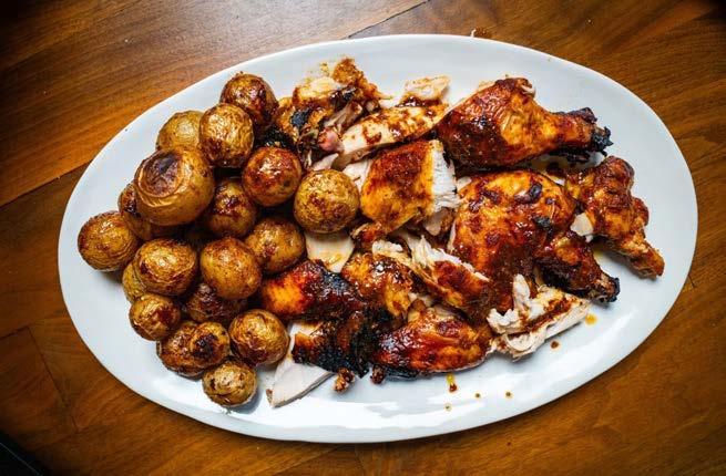 - Retirar la rejilla de asar y pasar las patatas a una fuente. Deje reposar el pollo de 15 a 20 minutos antes de trincharlo. Sirve el pollo con las patatas asadas, las tortillas calientes, los frijoles y la salsa.
