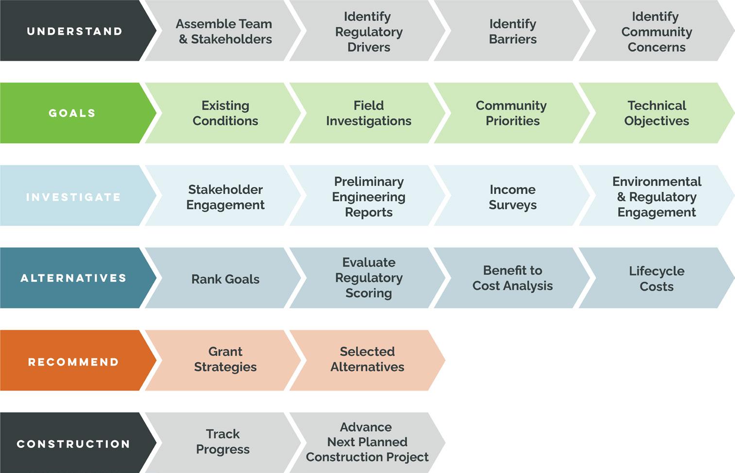 A key element of this approach is stakeholder engagement and collaboration throughout the technical planning process. Talking with both municipal leadership and municipal infrastructure operators ensures that community priorities are understood, project goals are clearly defined, and the performance of alternatives is thoroughly evaluated. When leaders from different community sectors are involved in dialogue and decisionmaking, it fosters a more comprehensive understanding of the community’s needs and aspirations, leading to more holistic and widely accepted solutions. Community priorities are not just heard but understood, project goals are not just set but defined, and alternatives are not just considered but thoroughly evaluated.