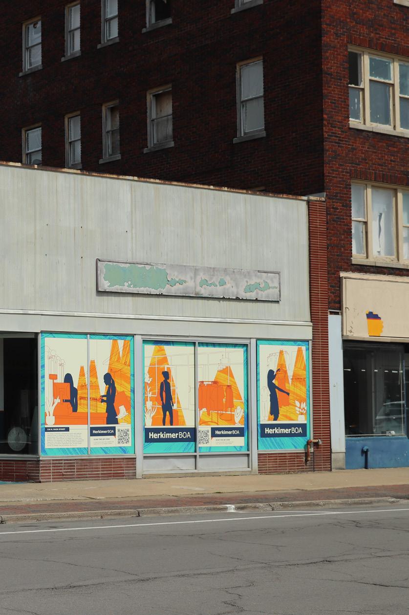 A standout element of the planning process was a unique, community-focused engagement strategy designed to bring planning concepts to life. In April 2025, LaBella led an interactive walking tour of North Main Street, guiding more than 50 participants—including local officials, developers, real estate professionals, and residents— through a series of vibrant storefront installations featuring artwork by Sidekick Creative. These eye-catching displays transformed vacant spaces into showcases of possibility, presenting conceptual reuse ideas, redevelopment strategies, and real estate information. The visuals reflected themes drawn directly from community input—such as small business development, local history, and the arts.