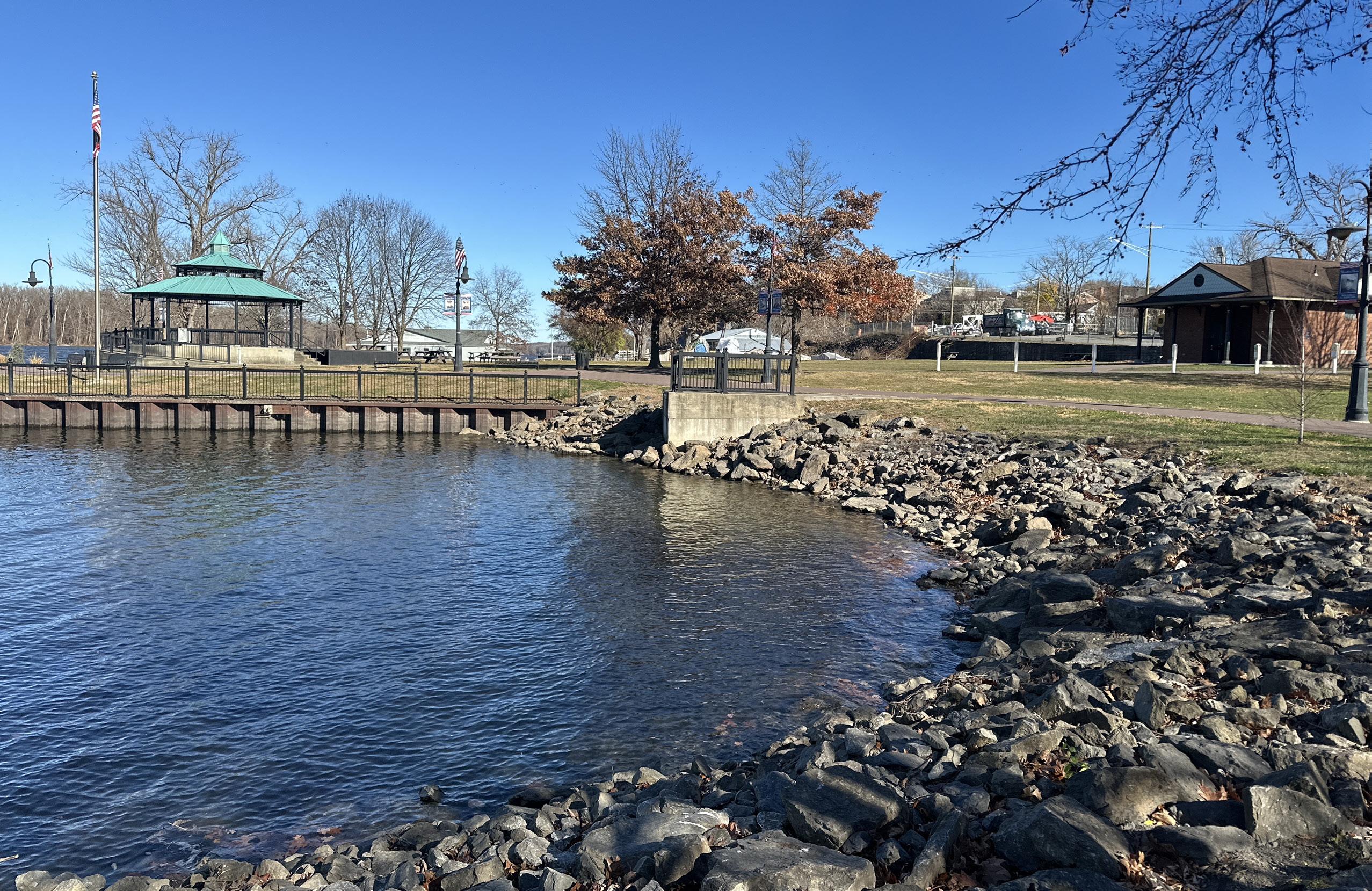Plans for the reimagined Henry Hudson Park in Hudson, New York, include forming an intertidal wetland area by excavating part of an existing peninsula. As part of this excavation, wooden crib walls that currently block water connectivity will be replaced with planted living shorelines. Soil removed from the peninsula will be used to build up the tip of the landform, which will eventually become a small island used for fishing as sea levels rise. A new pedestrian pier has also been designed to remain usable at elevated water levels but also to withstand temporary submersion during severe flooding.