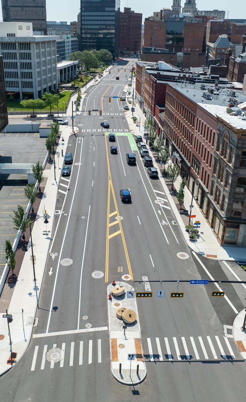 The reconstruction of State Street in Rochester, New York—a key arterial road with 18,000 daily vehicles—involved evaluating and upgrading infrastructure originally built in 1894 to improve its pavement structure and enhance Complete Street features. The project introduced modern accommodations for bicyclists, pedestrians, and parking, creating a safer, more accessible environment for all users.