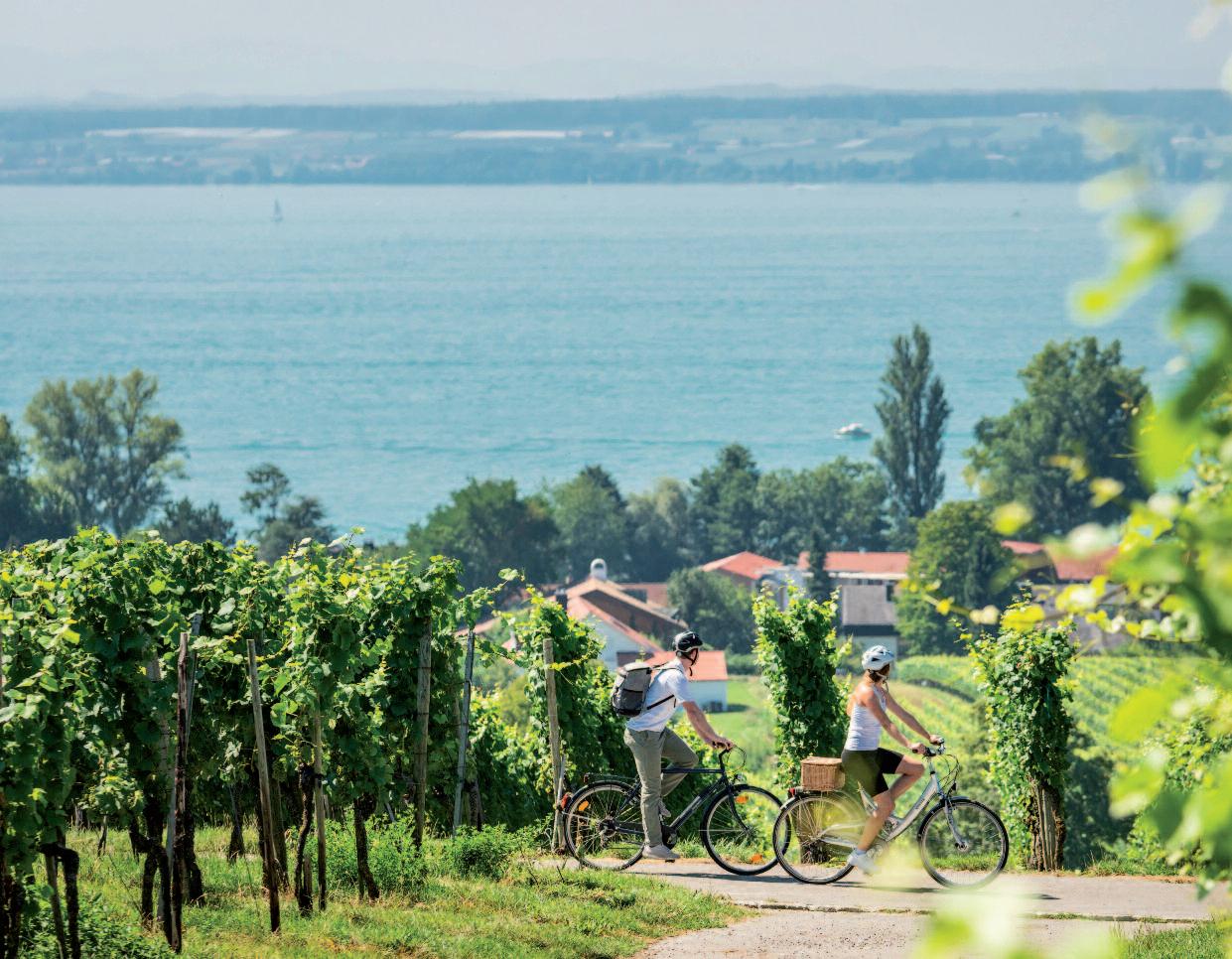 4 Viel See und Kultur: Die Basilika Birnau bietet neben einem überwältigenden Innenraum im Rokokostil auch eine umwerfende Sicht auf den Bodensee 5 Die Bodenseeregion ist nicht nur Obst-, sondern auch Weinregion Zahlreiche Radwege führen an prächtigen Weinreben und einladenden Gasthöfen vorbei