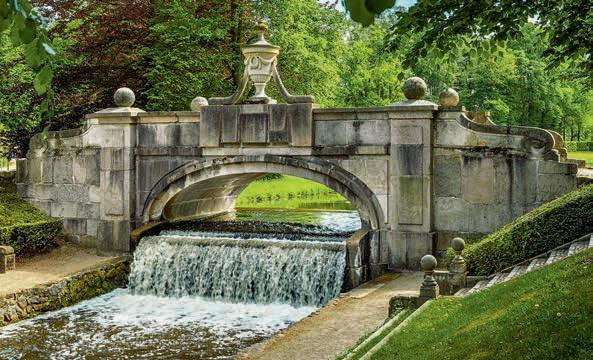 Johann Joachim Busch zurück. Den Blumengarten der Großherzogin plante Hofgärtner und Gartenarchitekt Theodor Klett. In dem umzäunten Gärtchen direkt neben dem Schloss steht auch das älteste Parkgebäude, ein kleiner chinesischer Teepavillon. Nur wenige hundert Meter entfernt liegt die Steinerne Brücke, unter der ein kleiner Wasserfall rauscht. Sie sei ein echtes Highlight, erzählt Dietmar Braune, Leiter des Dezernats Garten bei den Staatlichen Schlössern, Gärten und Kunstsammlungen. Und das nicht nur, weil sie toll aussieht. „In einem Park werden alle Sinne angesprochen, auch der Hörsinn, und das lässt sich entlang des Kanals schön nachvollziehen“, schwärmt Braune. Tatsächlich: Bei einem Spaziergang
