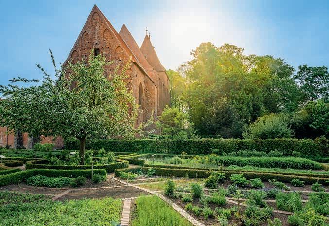 Etwas ehrwürdiger wird es ein knappes Autostündchen nordwestlich von Schwerin-Mueß. Der Klostergarten des 1237 gegründeten Klosters Rehna wurde 2004 nach altem Vorbild wieder neu angelegt. Der durchgängig geö nete, bunt bep anzte Garten hat eine wunderbar symmetrische Form. In den vier Beeten, die um ein kleines rundes Beet in der