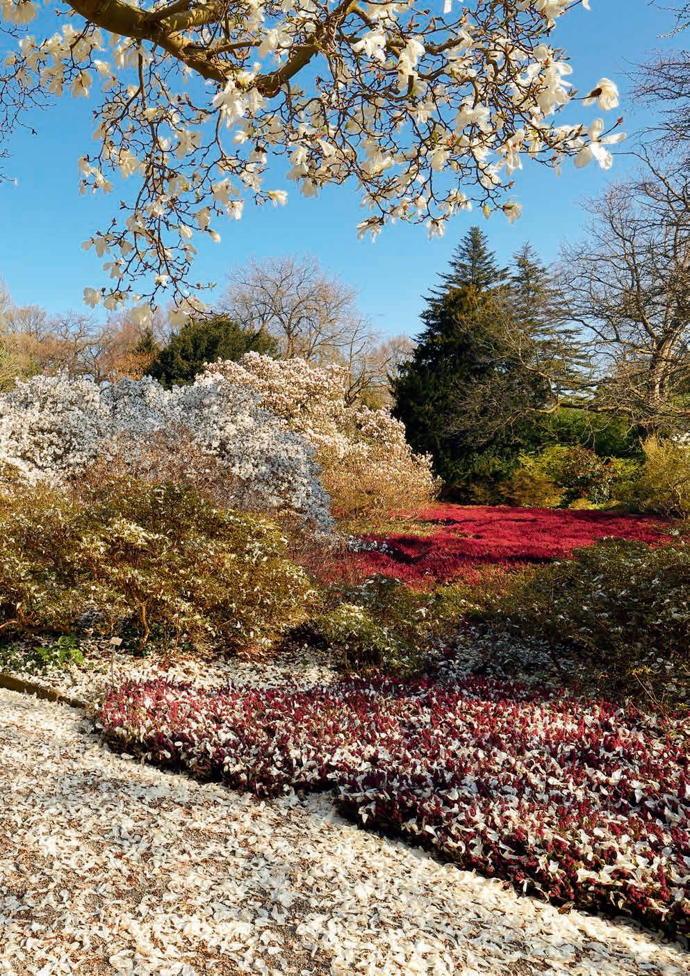 Die weichen Blütenblätter der Magnolie fallen stetig langsam von den Zweigen herab, bedecken Wiesen und Wege gar lieblich mit ihrem zarten Weiß. „Magnolienschnee“ knirscht nicht, wenn man seine Füße daraufsetzt, um den Pfad zu gehen, der hier im Berggarten-Paradies der Herrenhäuser Gärten Hannover so einladend lockt.