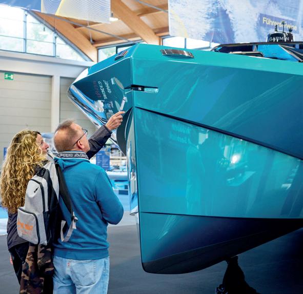 Trends, Innovation und elektrische Visionen Auch in Halle A5 kam Stimmung auf: Skimboarding war der Hit bei den Jugendlichen – geradeaus für alle, über die Schanze für die Cracks. Camper und Bentley ließ ich links liegen, mein Fokus lag auf elektrischen Flautenschiebern. Besonders beeindruckte mich der Remigo: ein Elektromotor aus einem Guss, Motor, Batterie und Pinne, nur 13 Kilogramm leicht und geformt wie ein Ruderblatt. Er führte mich zu Takacat, einem spannenden Angebot für sportliche Boote wie die J70. Bei Riomar, einem holländischen Anbieter, entdeckte ich kleine, charmante Motorboote. Sie gehören in die Kategorie Einsteigerboote bis 35.000 Euro – fahrbereit und mit Motor. Doch die Euphorie der Besucher hielt sich in Grenzen, das Einsteigerpublikum war spärlich vertreten.