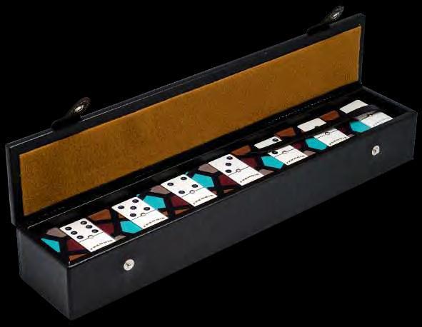 Elegante dominó con diseños estilo arlequín elaborado artesanalmente. Contenido: Estuche curpiel negro, 28 fichas tamaño profesional de acrílico de 4 capas. UPC: 655244020774