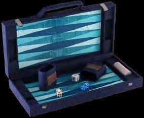 Maletín forrado en mezclilla (43 cm de largo x 20.5 cm de ancho y 7 cm de alto) con asa y dos broches de seguridad niquelados. Interior en tonalidades turquesa con campos sublimados. 30 Fichas, 5 dados y 2 vasos forrados en mezclilla.Contenido: 15 Fichas gris, 15 fichas color negras, 2 dados blancos, 2 dados color azul, 1 dado de doblar y 2 vasos.