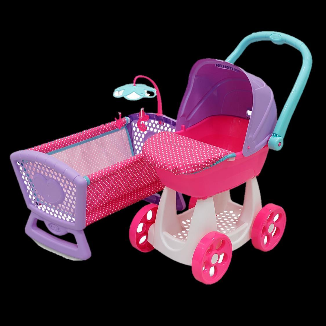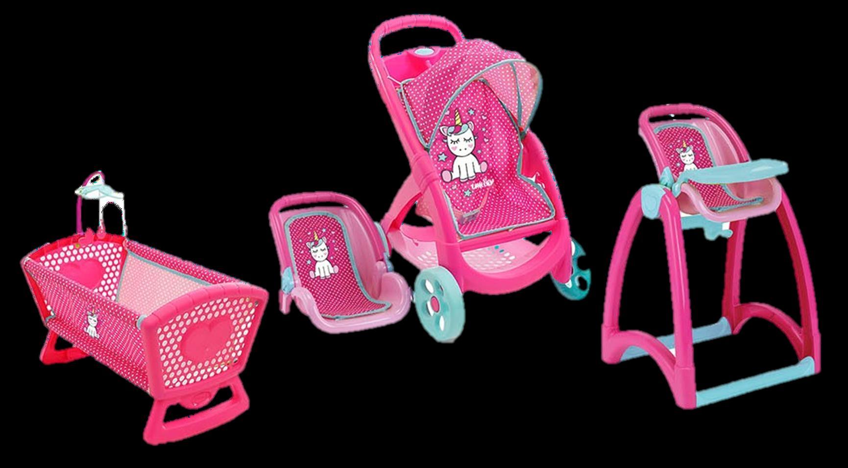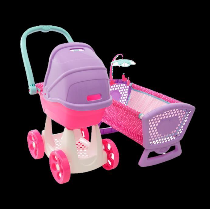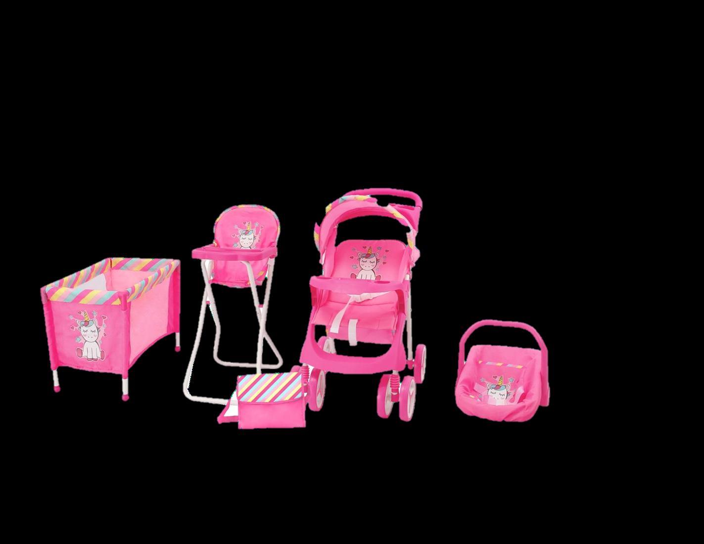 • Set de juego infantil que incluye carriola, portabebé, cuna, silla y pañalera.