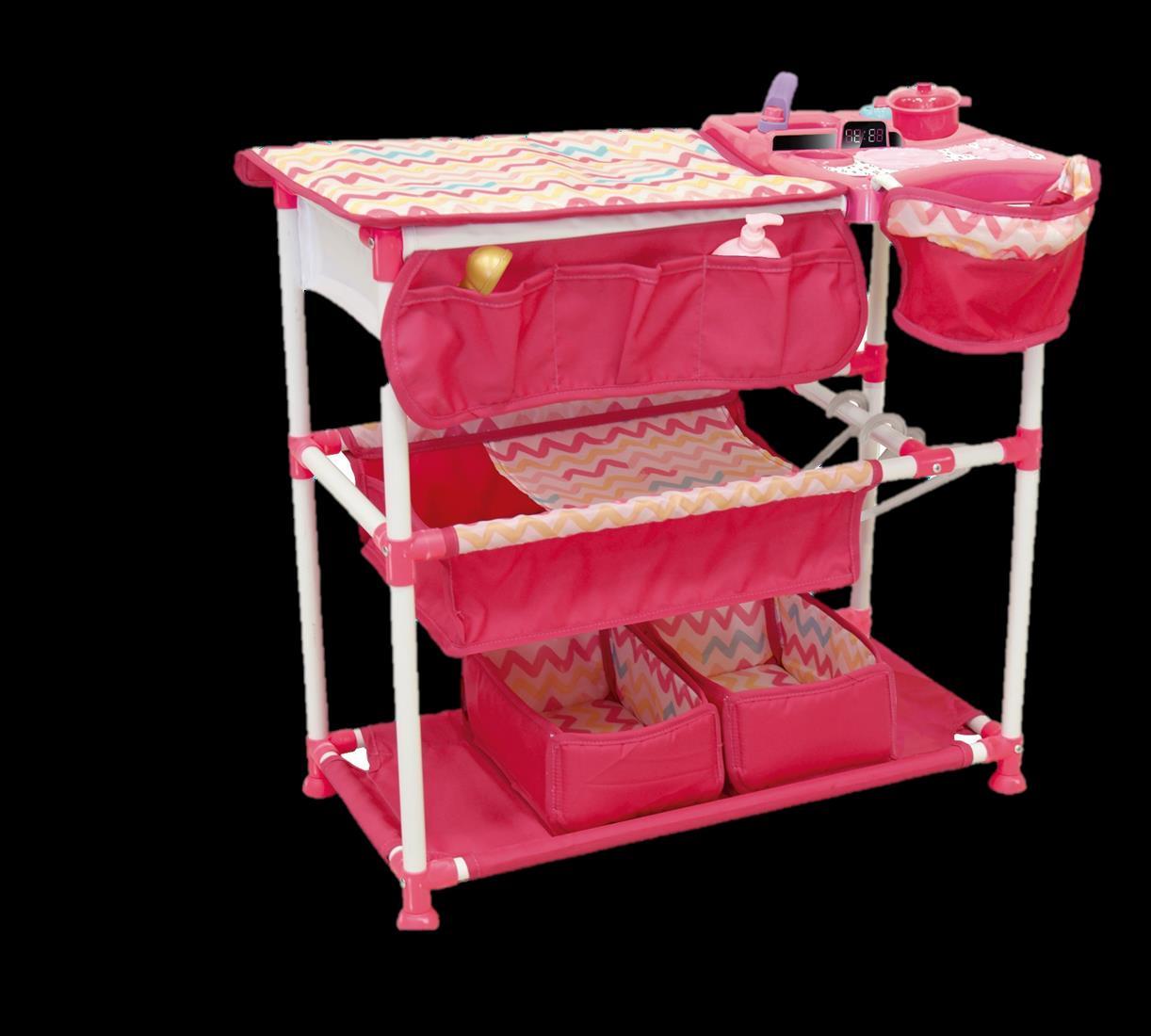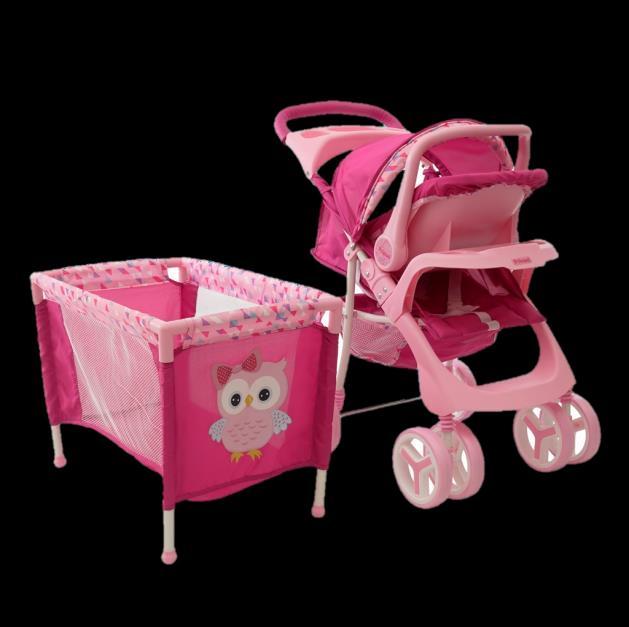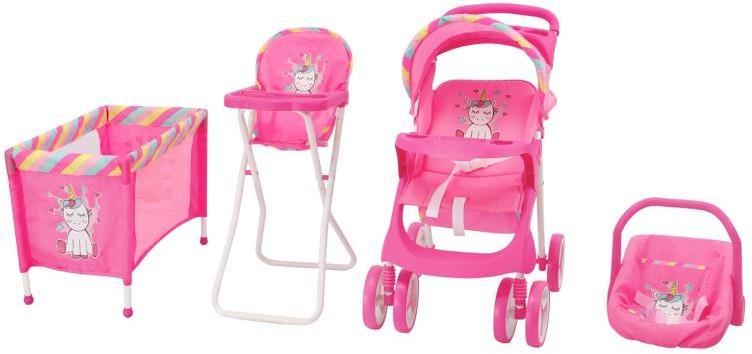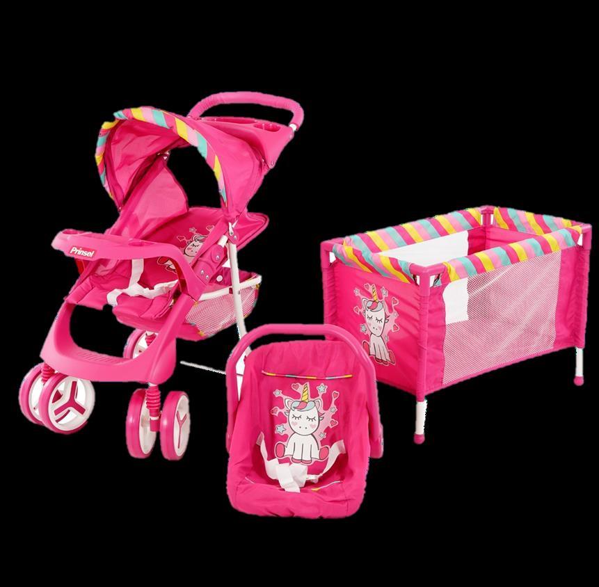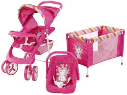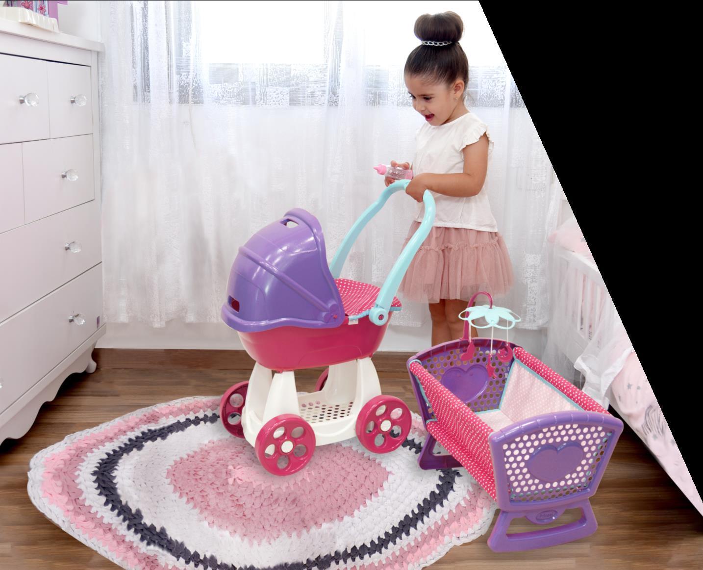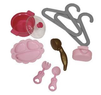 • Set de juego infantil que incluye carriola, portabebé, cuna, silla y pañalera.