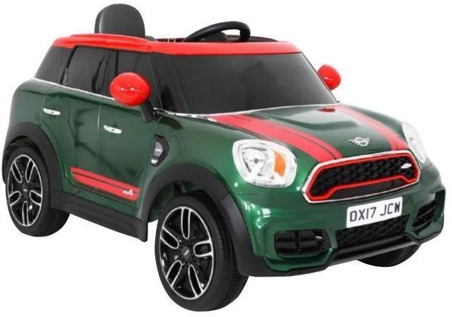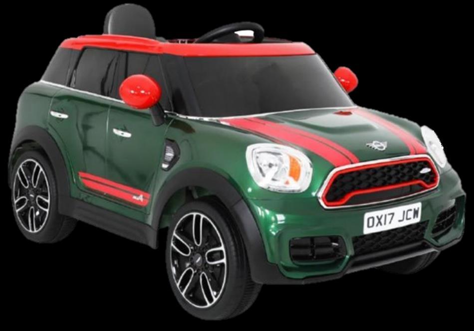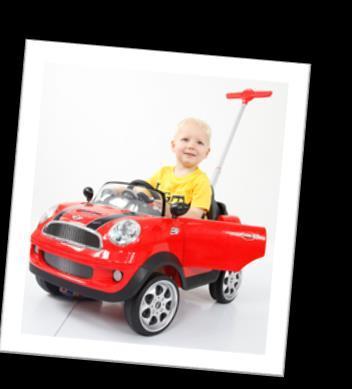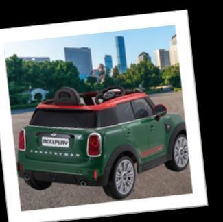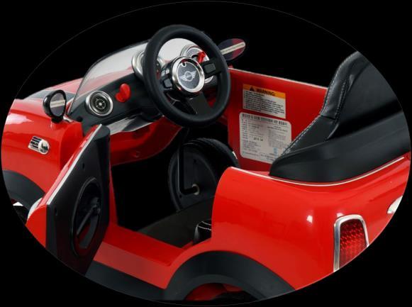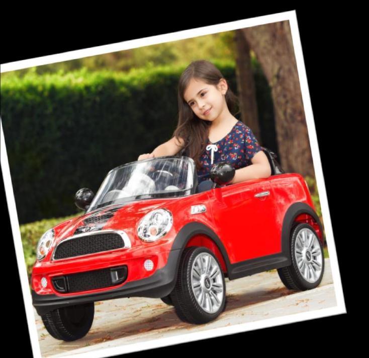 Mini Copper Auto Eléctrico 6V • Volante multifuncional con sonidos • Radio FM real y entrada MP3. • Cinturón de seguridad, marcha adelante/reversa y acelerador de pedal. • Batería seca recargable 1 x 6 volts (Incluye cargador) 1 motor. • Puertas con apertura y espejos plegables. • Ruedas con banda de hule para una mejor tracción. Rines deportivos. • Con control remoto 2.4 G, con hasta 15 mts. de alcance. Soporta hasta 22 Kg. MOD: 1214 1215 Ayuda a desarrollar: Coordinación de Movimientos Orientación Espacial Reflejos ELÉCTRICOS 24 ⊵ Video Video
