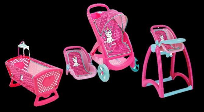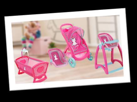 Doll Combo para muñecas • Set de juego infantil que incluye carriola, portabebé, cuna, silla y pañalera. • Materiales plásticos y tubo de acero. • Carriola con diseño realista incluye portavasos para mamá y el bebé. • Cuna fácil de desmontar incluye bolsa de traslado. • Silla plegable para fácil guardado Unicornio MOD: 4005 4008 2 Estimulación Afectiva Autonomía e Imaginación Responsabilidad CARRIOLITAS 72 ⊵ Video Video
