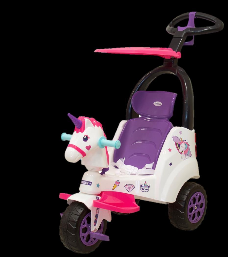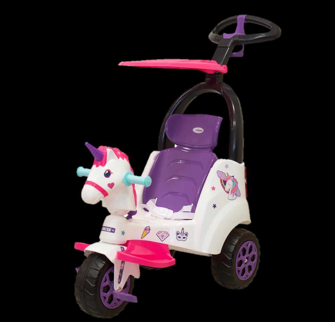 Super Trike Unicornio Triciclo Evolutivo • Respaldo Ajustable a 4 posiciones • Techo Removible • Descansa pies desmontable • Cinturón de seguridad de 3 puntos • Lluz y sonido en el cuerno del unicornio • Amplio compartimento trasero • Soporta hasta 25 kg ⊵ Video Video MOD: 1345 Ayuda a desarrollar: Estimulación Visual y Auditiva Fuerza en las piernas Orientación espacial Línea Unicornios UNICORNIOS 5