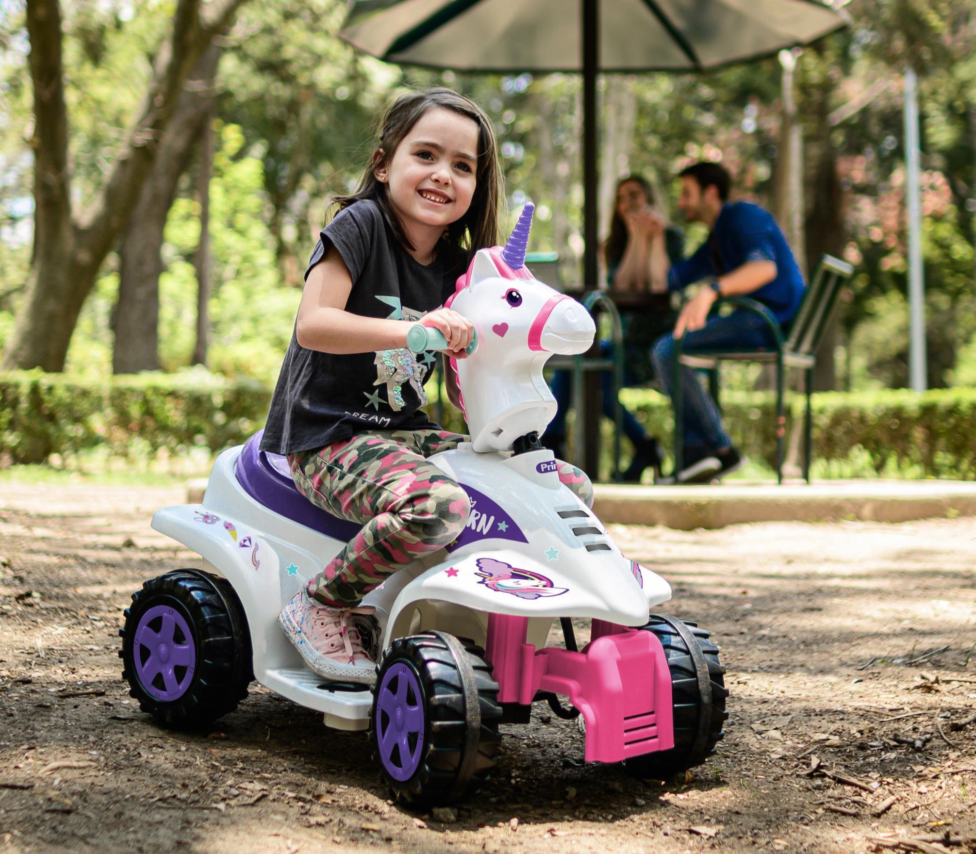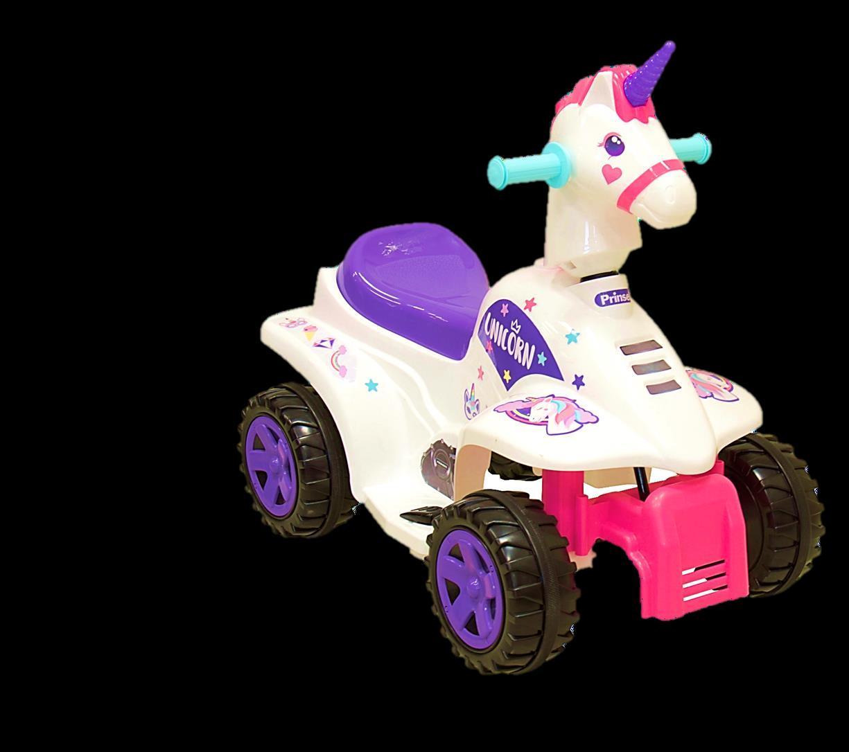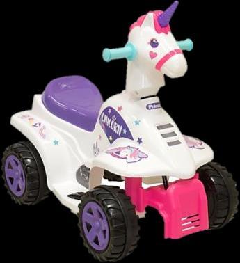 Mini Quad Unicornio Moto Eléctrica 6V • Ruedas anchas todo terreno • Ruedas traseras con banda de hule antiderrapante • Batería seca recargable 1 x 6 volts • (Incluye cargador) • Motor de 6V con velocidad de 4 km/hr, • Acelerador de pedal • Modulo en el cuerno con Luz y sonido • Soporta hasta 25 Kg ⊵ Video Video MOD: 1345 Ayuda a desarrollar: Coordinación de Movimientos Orientación Espacial Reflejos y Autonomía Línea Unicornios UNICORNIOS 4