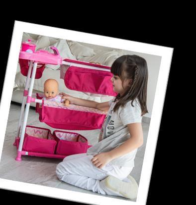 Play Doll Set de Juego MOD: 4002 • Combo para muñeca que incluye: • Bañera con Cambiador. Cocina con Fregadero. • Asiento para comer. Cuna. • 2 cestas para accesorios. • Closet con 2 Ganchos para Ropa. • 7 accesorios de cocina. 2 Ayuda a desarrollar: Estimulación Afectiva Responsabilidad Autonomía e Imaginación CARRIOLITAS 71 ⊵ Video Video