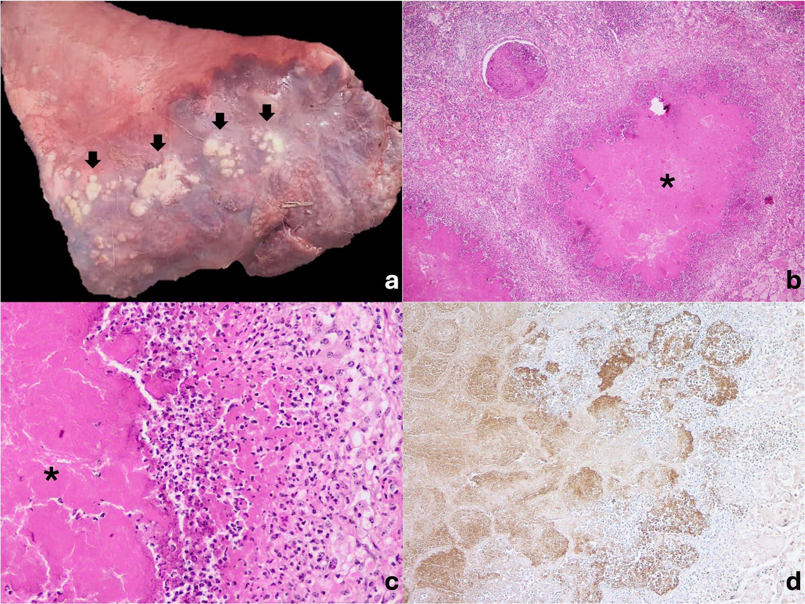Fig. 1 Pulmonary mycoplasmosis pathological findings in marsh deer (Blastocerus dichotomus). A. Gross lung findings. Cranioventral caseonecrotic bronchopneumonia characterized by multiple coalescing protruding white nodules (black arrows). B and C. Microscopic lung findings. Multifocal caseonecrotic bronchopneumonia with foci in bronchioles and alveoli characterized by a hypereosinophilic core of necrotic debris (asterisk) surrounded by neutrophils, a rim of macrophages, occasional lymphocytes, and fibroblast proliferation. Hematoxylin and eosin. 10x (B) and 40x (C). D. Immunohistochemistry. Positive immunolabeling for M. bovis in lungs staining the margin of the caseonecrotic foci and, to a lesser extent, at the center of the necrotic foci. 10x.