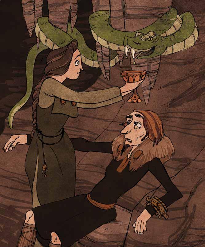 Siguna paused to toss a cup of poison away Loki writhed in pain as two drops of poison fell on him