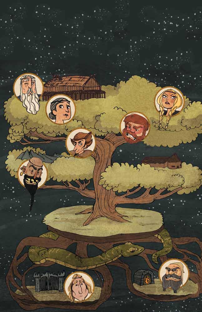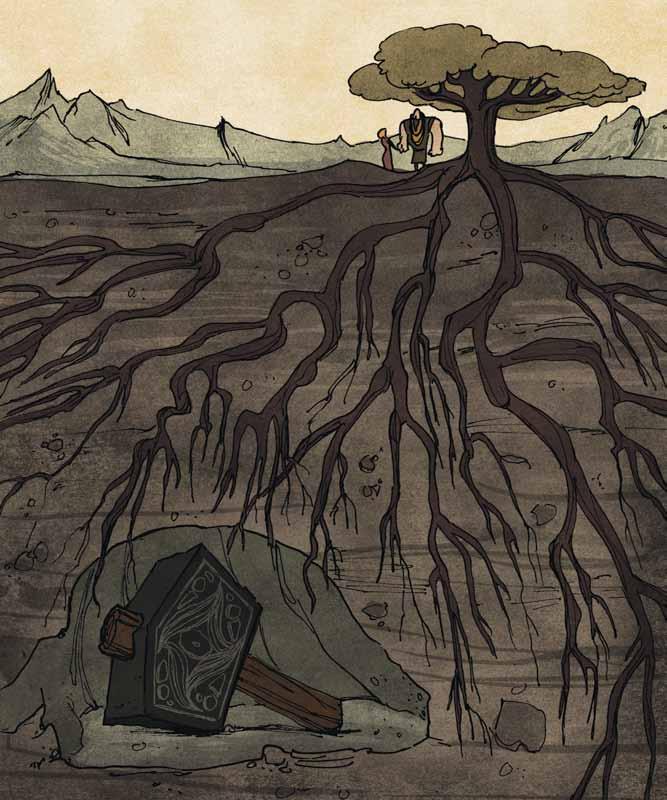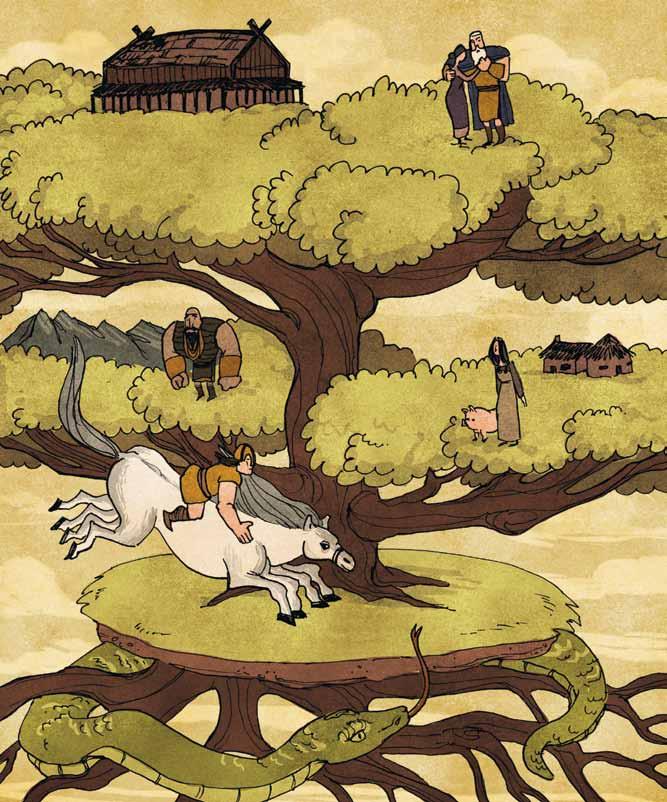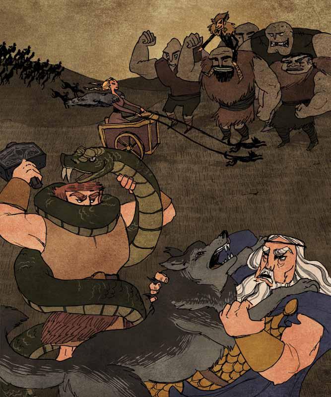 “When Ragnarok comes, Yggdrassil [eeg-dro-sil], the tree that holds up the world, will tremble The giants will rise and fight against the gods A great eagle with a white beak will shriek in the sky Your son, Fenrir the Wolf, whom they keep chained in a cavern like this one, will break his chains and attack the gods themselves He will swallow up Odin himself Meanwhile, Jormungand [yor-mun-gond], the mighty serpent whose body encircles the earth, will do battle with Thor—and Thor will not escape his fate None of the gods will escape! All of them will die! The sun will turn black Earth will sink into the sea The stars will vanish The world will be destroyed!”