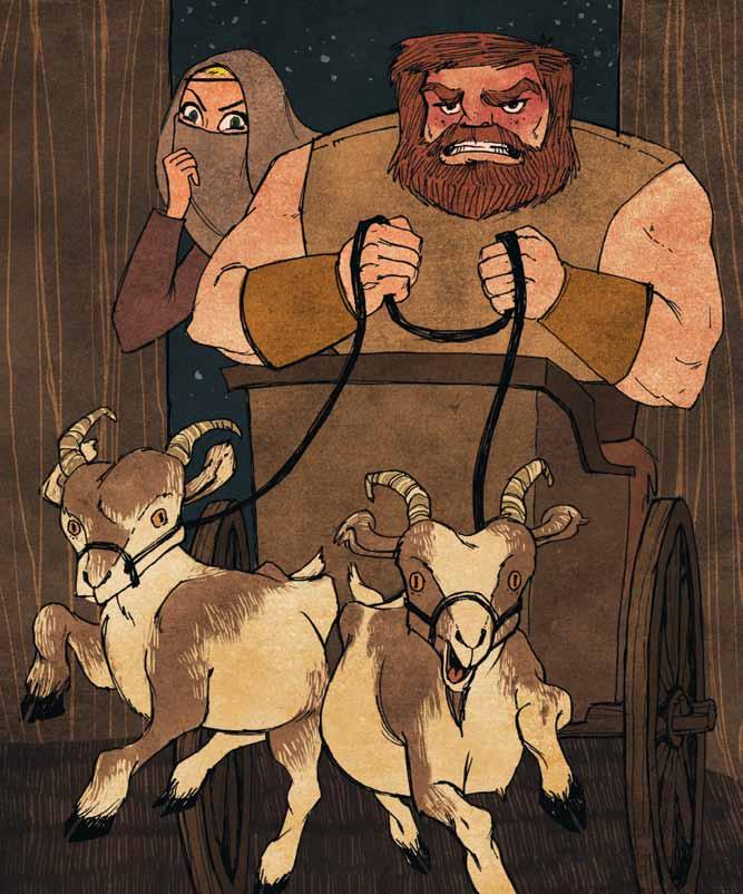 Odin stood up to leave, but just then, he heard a clap of thunder, the snorting of goats, and the skidding of a cart He knew that could only mean one thing: his son Thor was arriving in his goat-drawn cart