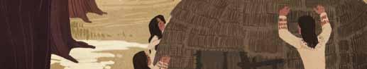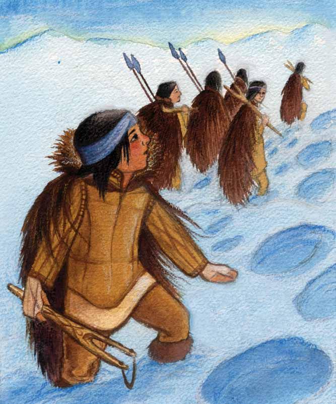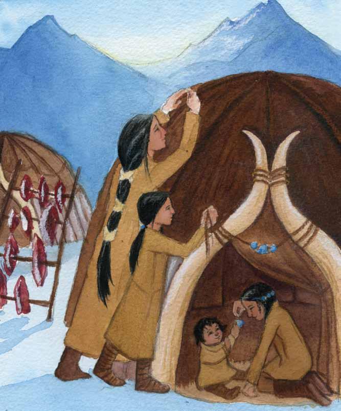 We walked until the sun began to sink in the sky and a golden haze touched the shimmering earth . I spotted various clumps of tall grass that brought faint color to the mostly white, crisp terrain . As we walked, I thought about my mother and sister, who were also at work . They were repairing the shelter we had built from mammoth skin, bones, branches, and earth . Several days earlier, strong winds had damaged the camp we had set up near the herd . They knew, as did we, that mammoth flesh could feed many people for quite some time . It could be dried and saved so that it lasted until the next successful hunt . A mammoth’s skin and fur could be made into warm clothing or it could be used to make a cozy shelter .