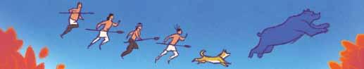 My father and uncles moved in a straight line some distance behind us . These were the men in our family who hunted and killed the great creatures that roamed across the land we lived on . Each man held a flint-tipped spear and an atlati, or spear thrower . My brothers and I had our slingshots slung over our shoulders . This was my first hunt . We were following a herd of woolly mammoths . We were waiting for one member of the herd to fall behind . As soon as it did, the men would move forward and drive it into a ditch . We had to be careful though . It was important that the creature did not sense our presence . If it did, it would certainly charge at us using its great size and curved tusks as powerful weapons . If this happened, the herd itself would panic and would stampede for sure .