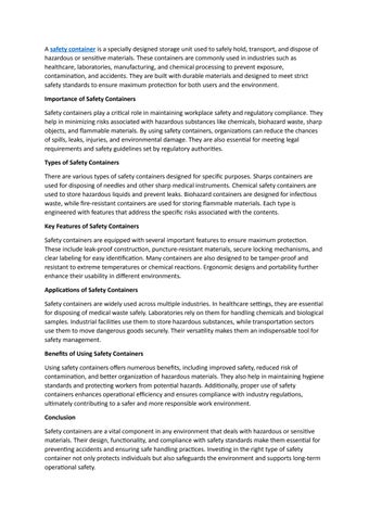 A safety container is a specially designed storage unit used to safely hold, transport, and dispose of hazardous or sensitive materials. These containers are commonly used in industries such as healthcare, laboratories, manufacturing, and chemical processing to prevent exposure, contamination, and accidents. They are built with durable materials and designed to meet strict safety standards to ensure maximum protection for both users and the environment.