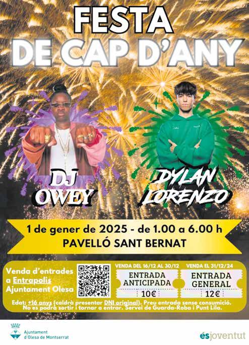 Dimarts 31 desembre Sopar ‘Adeu, 2024’ 21h. Sala del CCR Campanades d’any nou 23.45h. Pl. d’Europa Festa amb DJ 00.30h. Sala del CCR