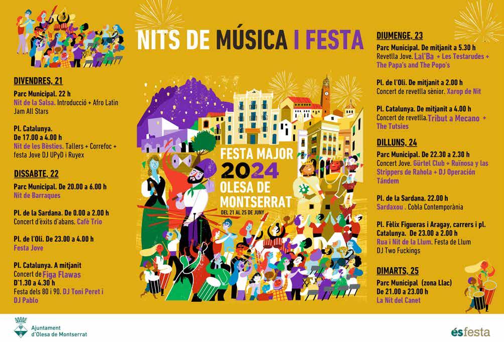 Destaquen els actes de la revetlla de Sant Joan, la Rua i Nit de la Llum, els espectacles per a tots els públics, la Trobada de Gegants, la celebració dels 40 anys d’agermanament amb Weingarten i l’espectacle de dansa de l’Esbart Olesà. També les nits de música i festa amb la Nit de la Salsa, de les Bèsties i de Barraques, la Festa Jove, els concerts de Figa Flawas i Lal’Ba, la Festa Jove i les sessions de Dj. La festa acabarà el dimarts dia 25 amb la ballada de sardanes i la Nit del Rock Català.