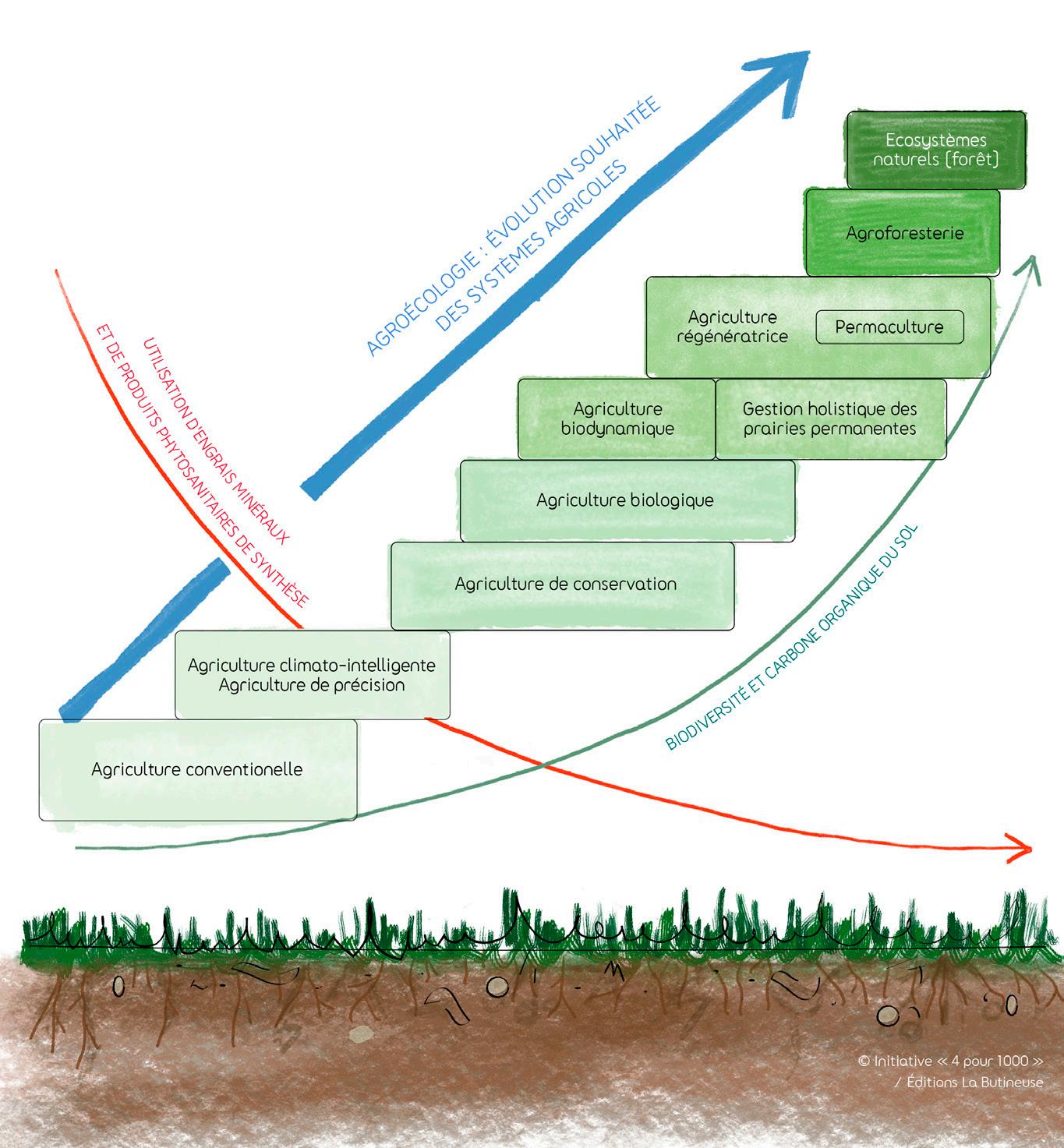 Entre ces deux points, il existe différents types d’agriculture, qui relèvent de ce que l’on appelle communément l’agroécologie et qui présentent tous des avancées dans la bonne direction. Il est également intéressant de voir que certaines de ces agricultures peuvent s’inspirer de ce qui a déjà été expérimenté dans le passé, en revisitant les savoir-faire traditionnels grâce aux connaissances et aux moyens d’aujourd’hui. Beaucoup de ces pratiques