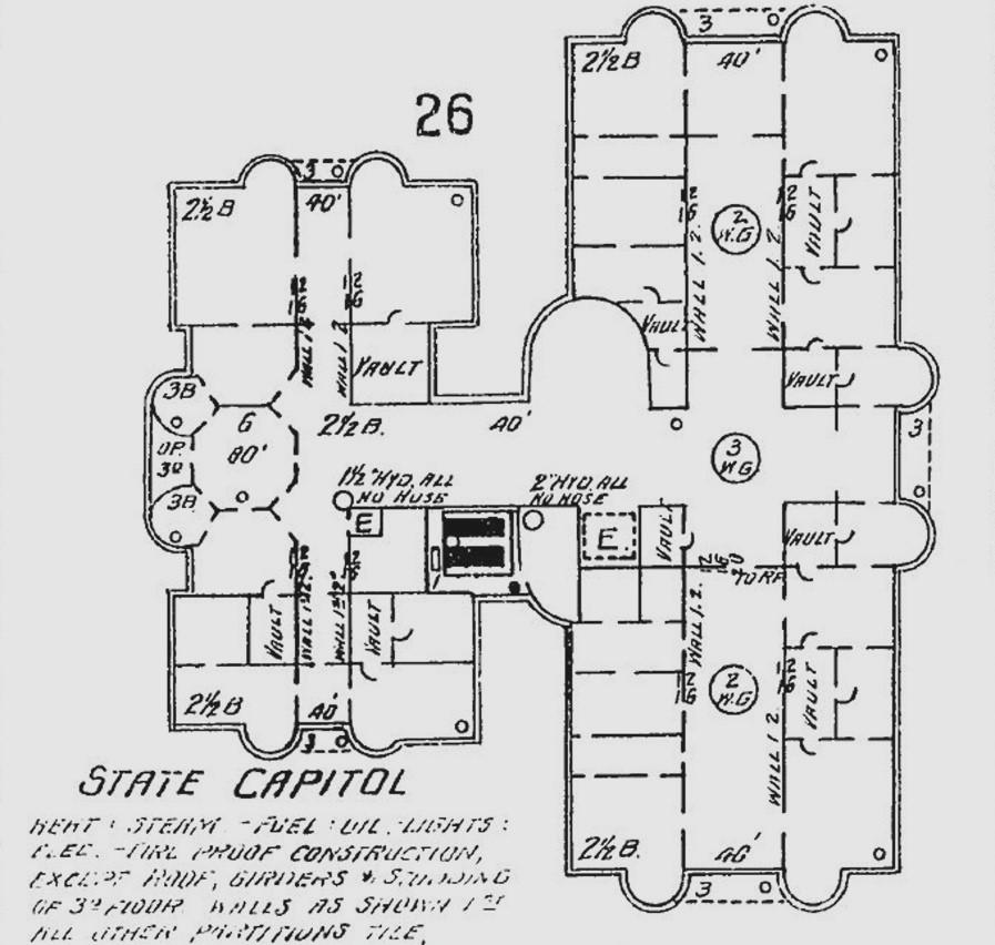 three blocks long. It is visible in Figure 6, which is part of a Northern Pacific Railroad Right-of-Way Plat Map. The “Old State Capitol Building” in Block 26 displays an inaccurate representation of that building’s floor plan. Purportedly, that structure is where the secret passage originates. The building currently houses the Washington State Office of Superintendent of Public Instruction. However, when built in the early 1890s, it was used as the Thurston County Courthouse. The original structure was purchased by the State of Washington in 1901 and became the state’s capitol. Construction of the Annex, immediately to the east, was begun that same year and completed in 1905. The Superintendent of Public Instruction moved into the finished building in 1906. Together, the original building, plus the Annex, is known today as the Old Capitol Building.