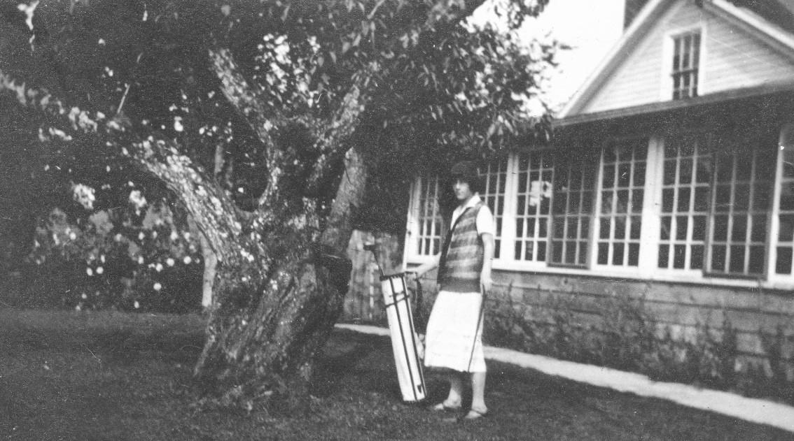A lengthy article about Henderson Luelling, written in 1929, noted that the author visited the Chambers homestead in 1928 and the tree was still in existence.29 But the end was near. A photograph in the Lacey Museum collection shows a young golfer, Mildred Kearney, standing next to the tree in about 1929. Another page of the album shows a group of women golfers teeing off from the clubhouse’s south lawn. The tree had been chopped down, but its huge stump is visible behind the women. Extending from the stump are two leafy shoots, valiantly but vainly striving for life.