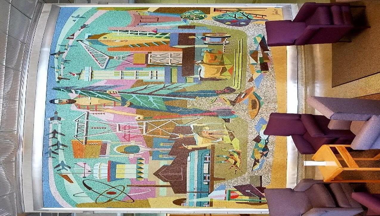 “Her commission for the General Administration Building was selected from among eight designs and cost $12,880. The convex mosaic dominates the lobby, measuring 10.5 feet high and 29.5 feet long, and includes iconographic imagery representative of Washington's industrial and natural resources. The design references the state's atomic research center, aeronautics industry, hydroelectric power