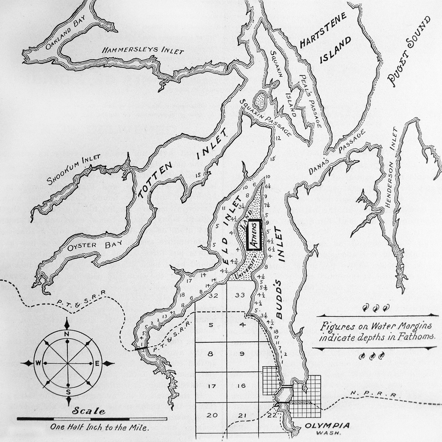 on Cooper Point called Athens. The university never moved there from downtown Olympia, closing its doors in 1906. Nonetheless, the surveyed