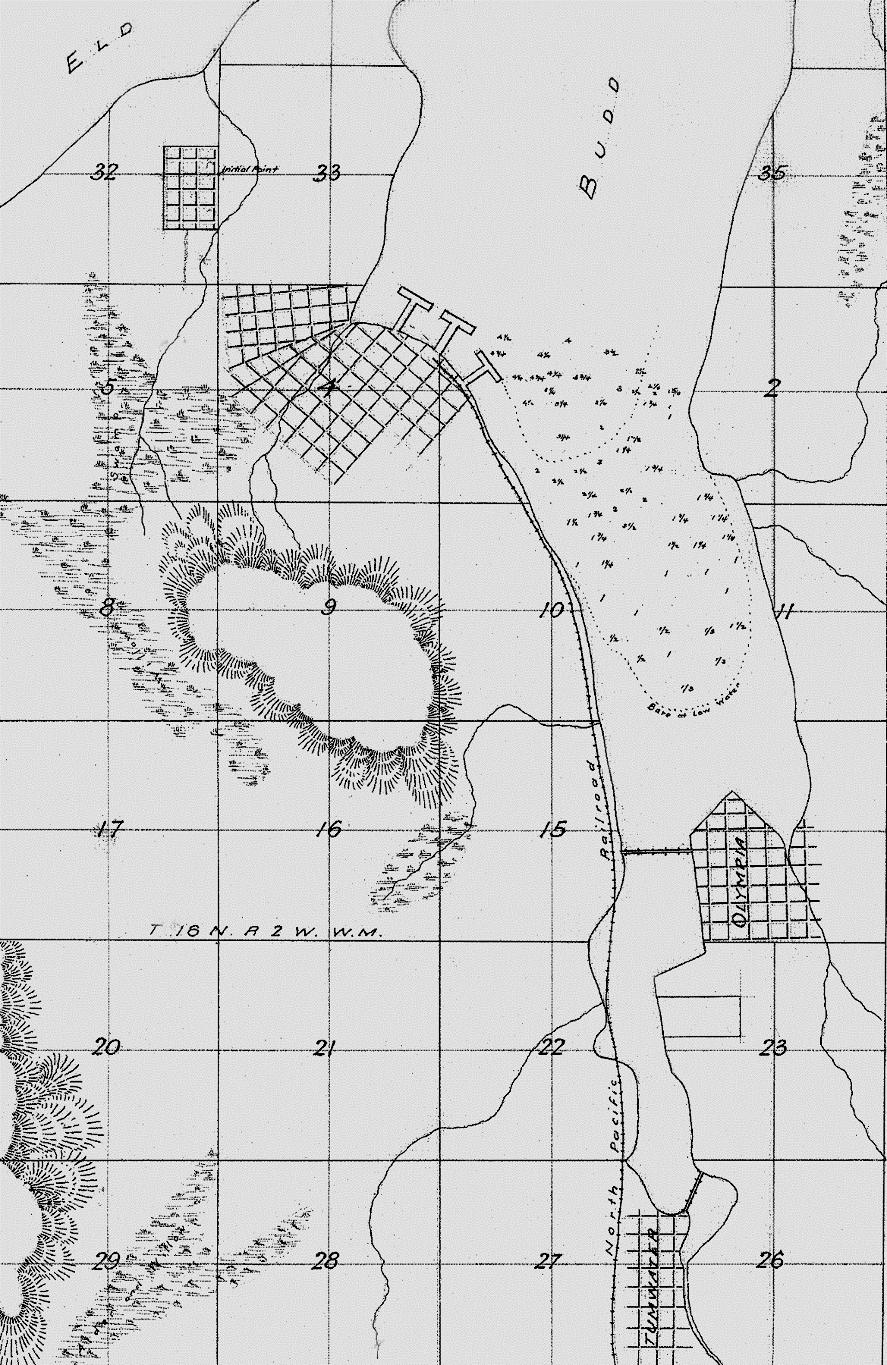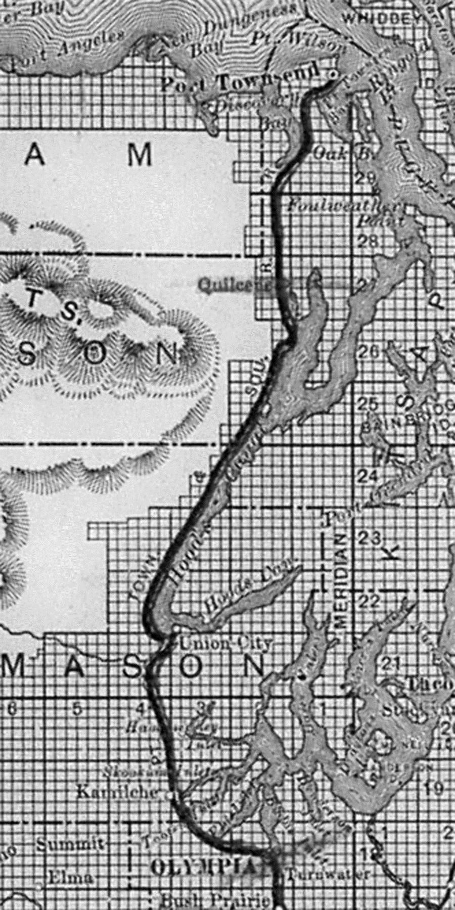 2 In Mason County Deed Book S, pages 267-269, dated June 19, 1889, the Port Townsend Southern Railroad Company buys 500 lots in Union City from the Hoods Canal Land & Improvement Company. The sale was conditional upon the location, by July 1, 1890, of a standard-gauge railroad from the Bay of Port Townsend, via the west side of Hood Canal, to the Columbia River “or with some railroad in Washington Territory in operation, and having transcontinental connections.”